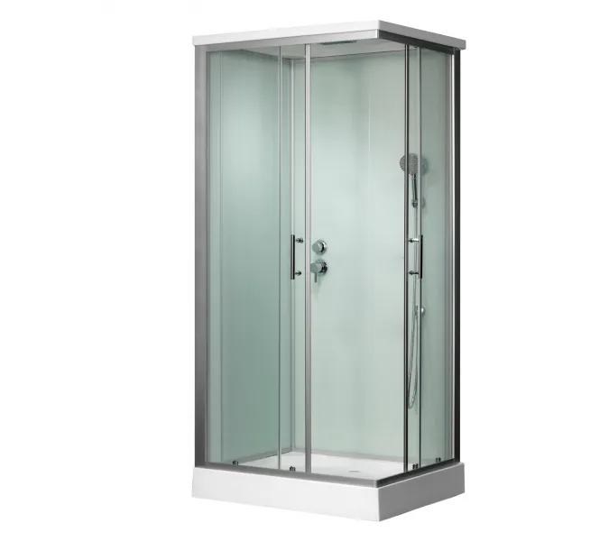 Двери в кабине раздвижные, плавность хода которых обеспечивают двойные металлические ролики, а на торцах дверей установлены алюминиевые магнитные полосы для плотного закрывания душевой кабины. В крышу вмонтирован большой верхний душ (тропический). Поддон из 100% акрилового листа с дополнительной армировкой и усиленным метеллическим каркасом. Для предотвращения засорения слива, в сифоне установлен легкосъёмная колба для сбора мусора и волос.