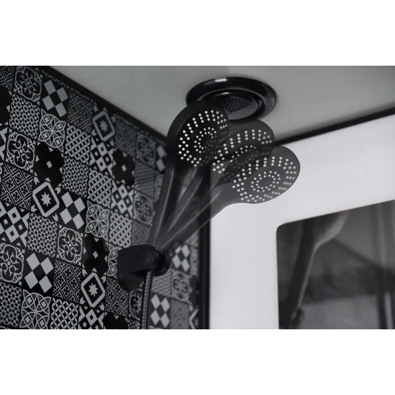 Кабина полукруглая ESBANO-ESB-80CR-низкий (15 см) акриловый поддон черного цвета-сифон с гидрозатвором, крышка сифона в цвет поддона-задние стекла: закаленное крашеное чёрно-белое стекло, закаленное крашеное декорированное стекло (5мм)-передние стекла: за