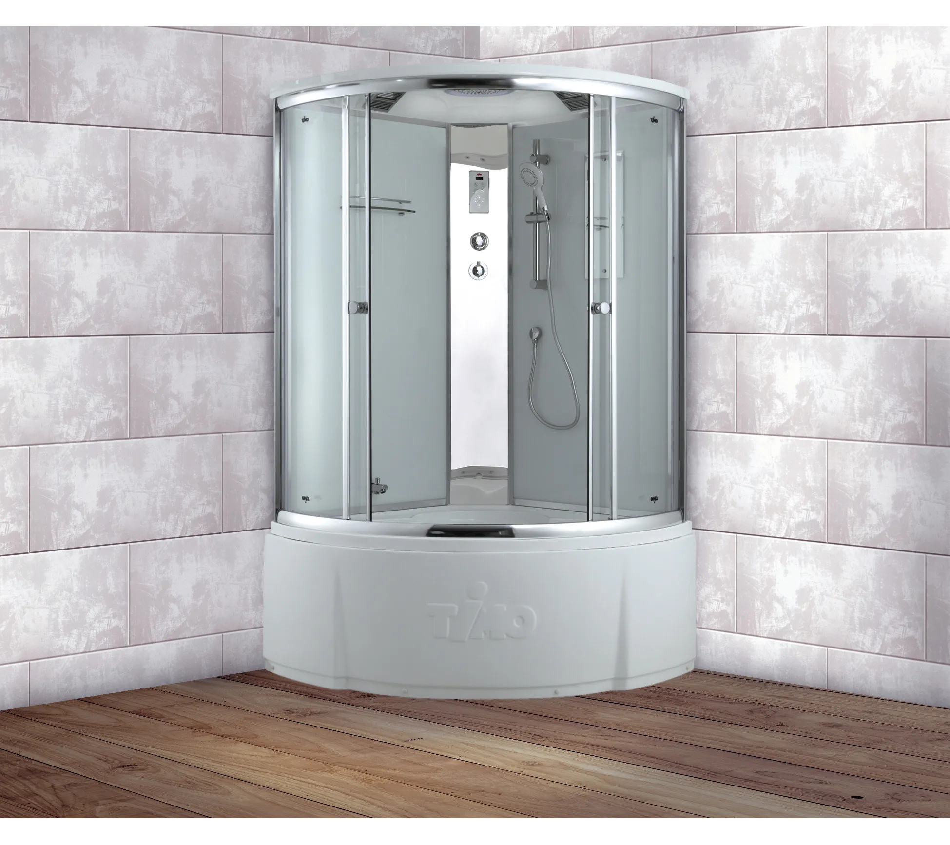 сенсорная панель управления, FM радио; подсветка (возможна комплектация в двух вариантах, интегрированная в троп.душ или отдельная, в зависимости от поставки); стеклянная полочка; электр. вентиляция; стеклянная полочка; смеситель; слив-перелив; тропический душ; сидение; ручная лейка с шлангом из ПВX; регулируемая по высоте штанга из нержавеющей стали; два подголовника