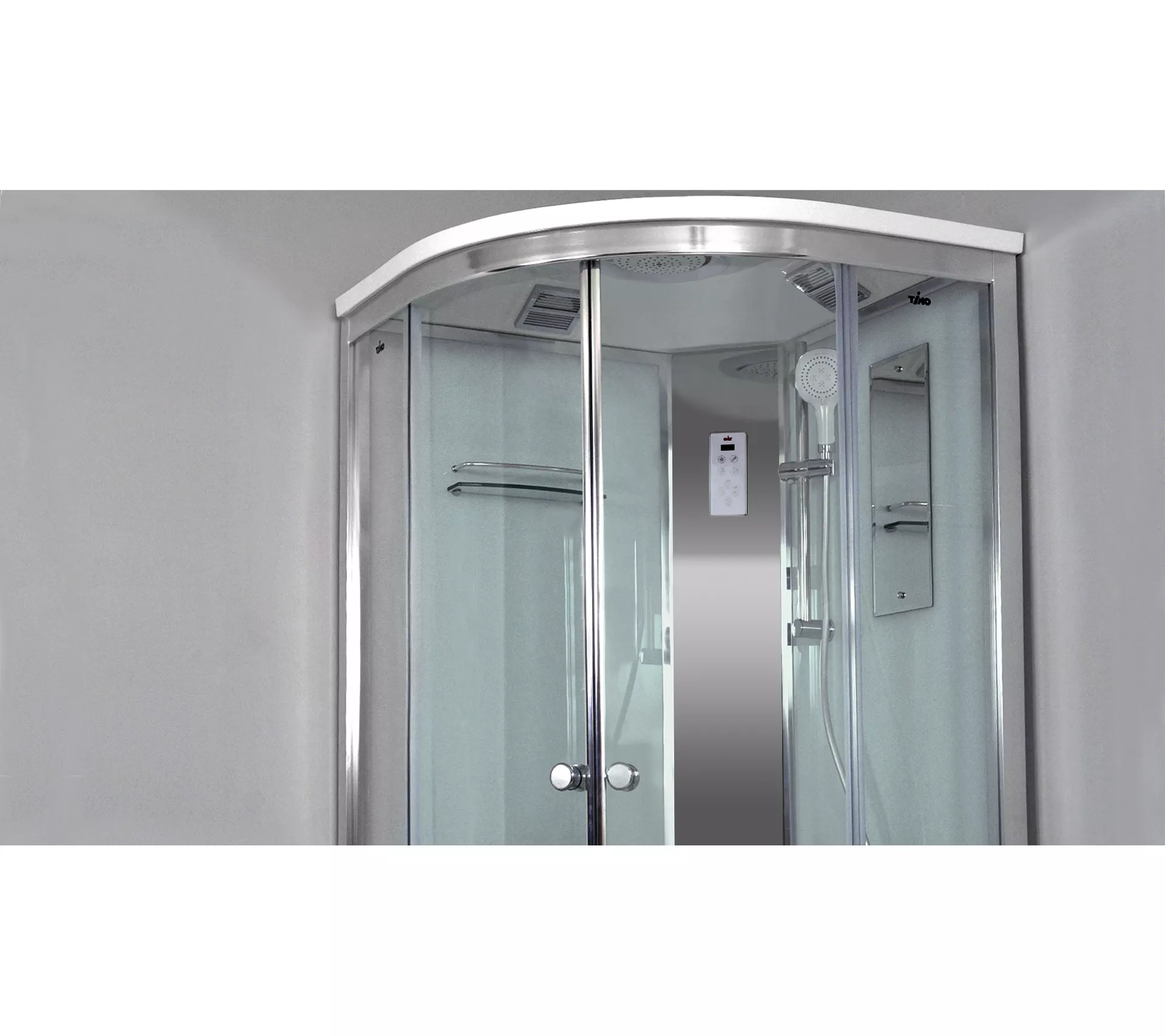 сенсорная панель управления, FM радио, подсветка (возможна комплектация в двух вариантах, интегрированная в троп.душ или отдельная, в зависимости от поставки); смеситель; электр. вентиляция; стеклянная полочка; тропический душ; ручная лейка с шлангом из ПВX; регулируемая по высоте штанга из нержавеющей стали.