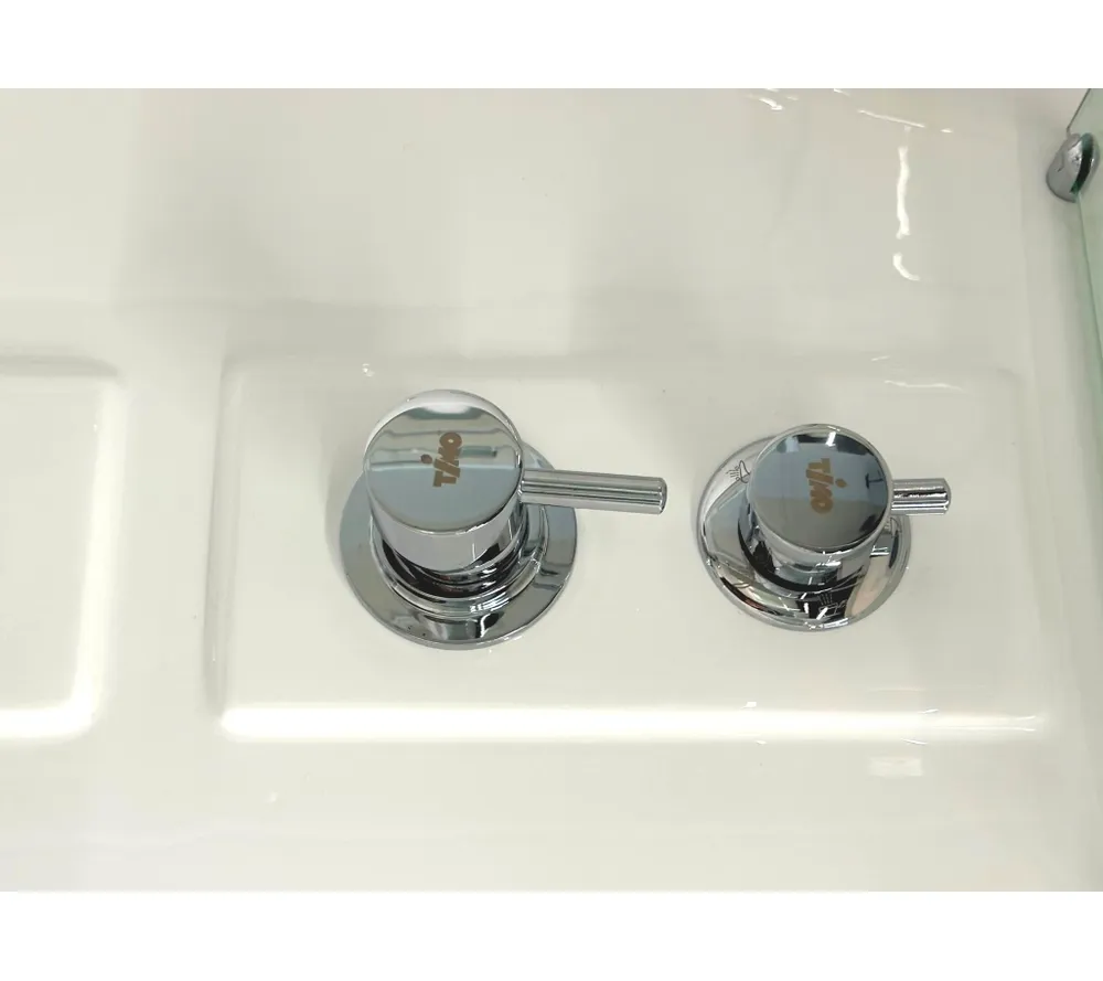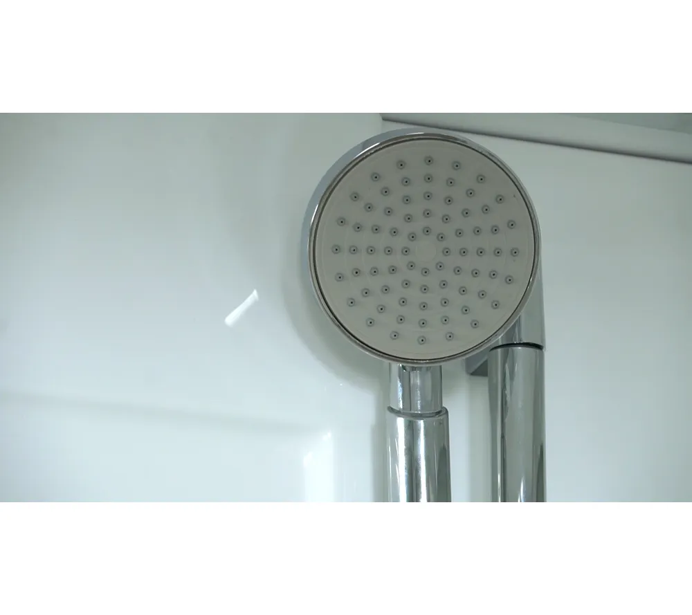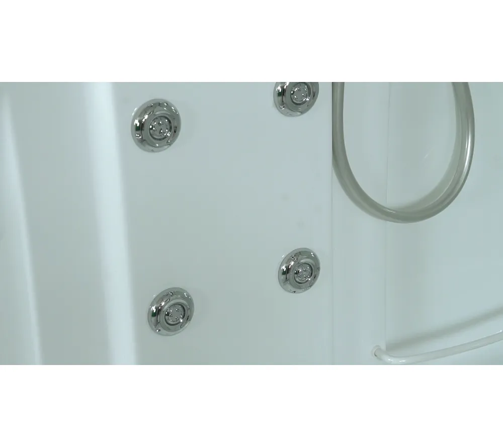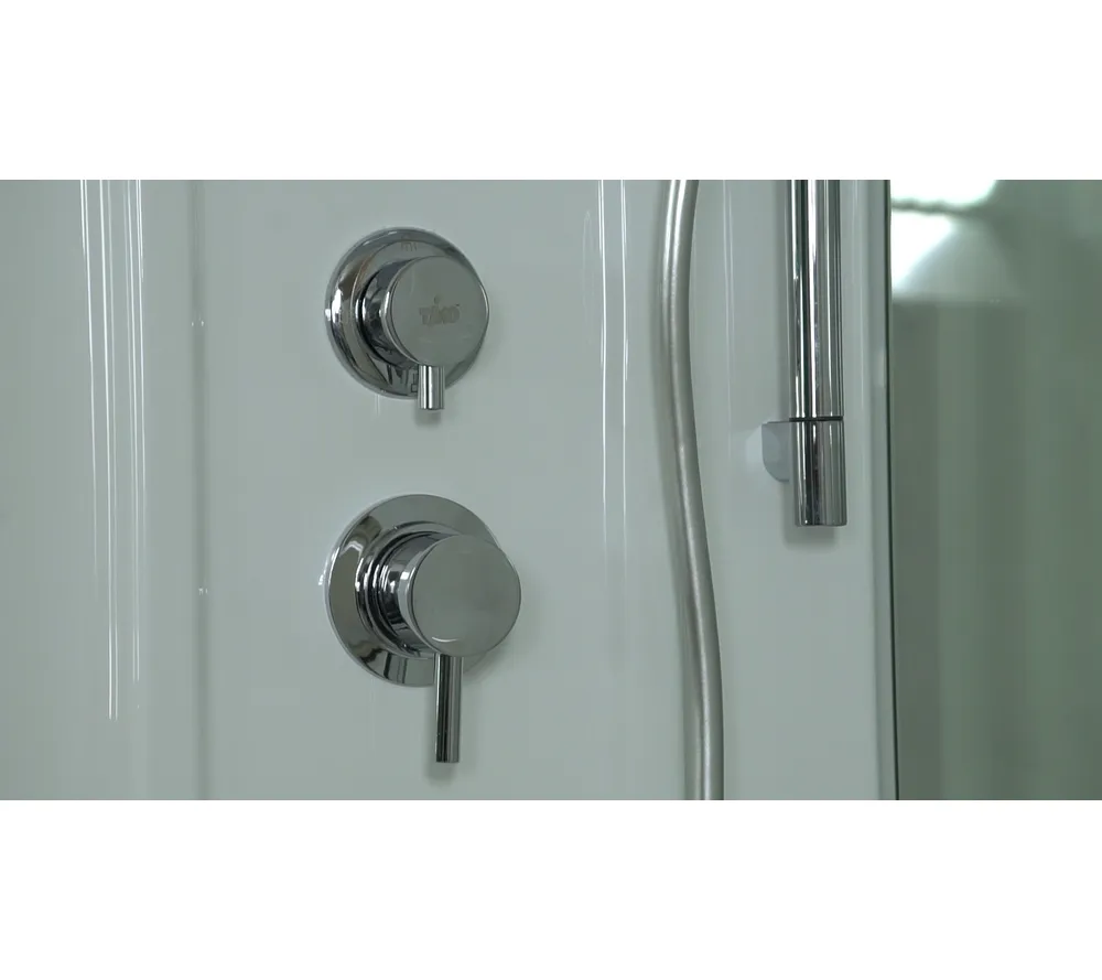 Комплектация: сенсорная панель управления, FM радио; стеклянные полочки; зеркало; электр. вентиляция; подсветка (возможна комплектация в двух вариантах, интегрированная в троп.душ или отдельная, в зависимости от поставки), смеситель; гидромассаж спины 6 джет; верхний душ; ручная лейка на регулируемой по высоте штанге; налив в ванне; слив-перелив; подголовник