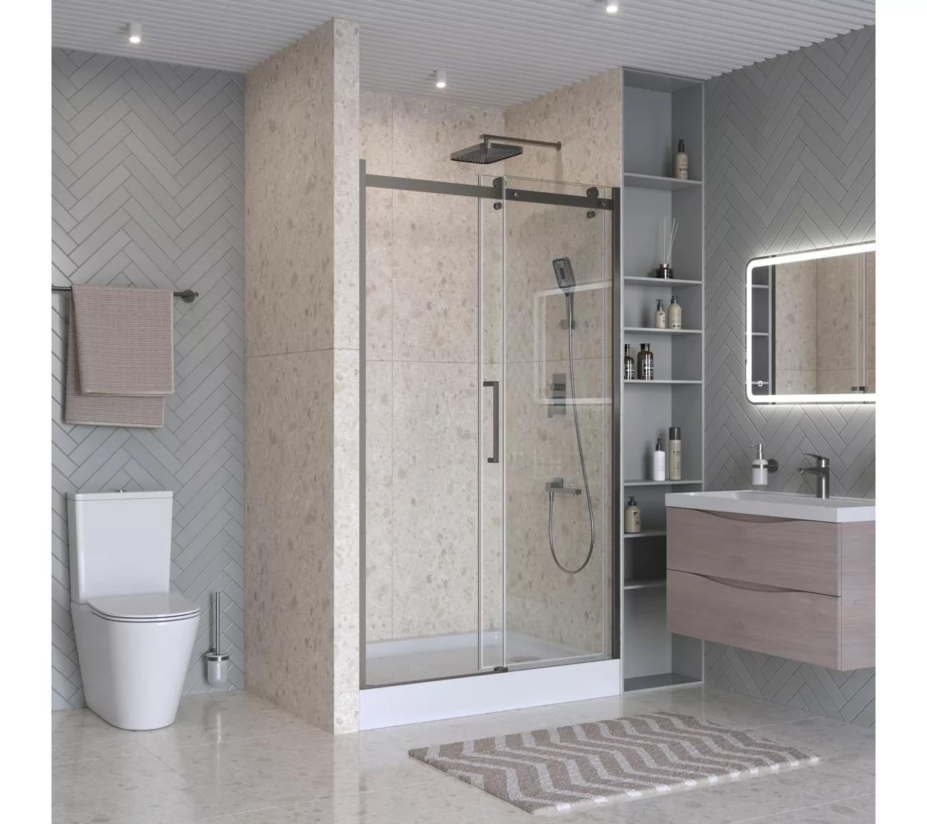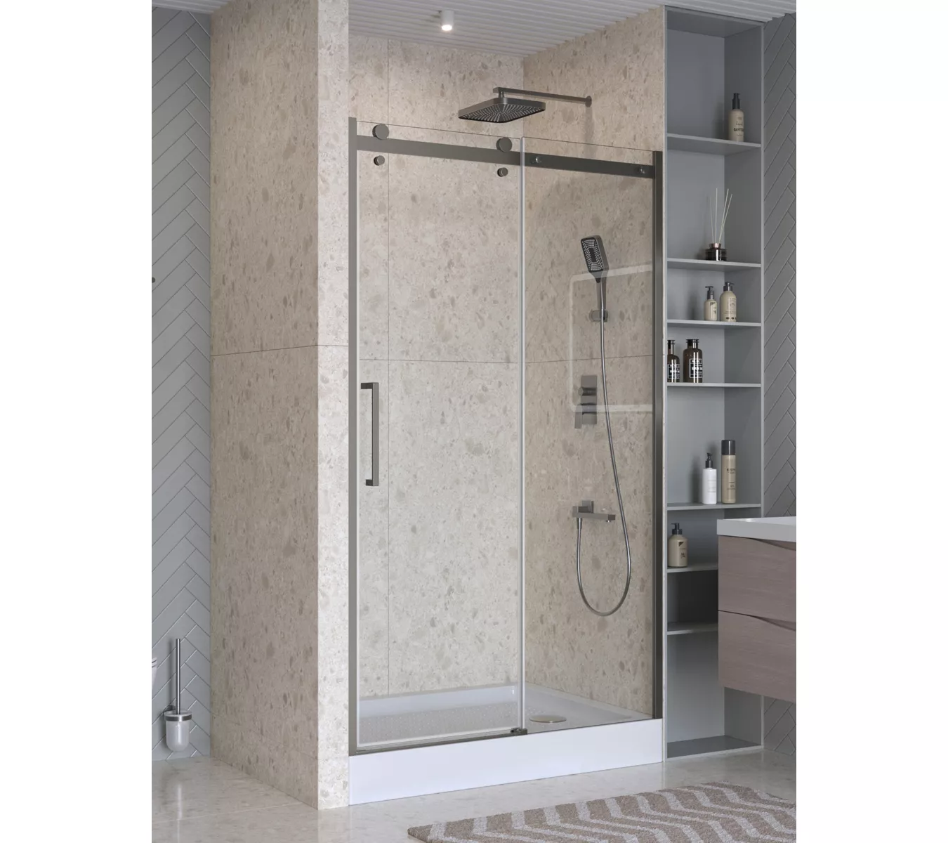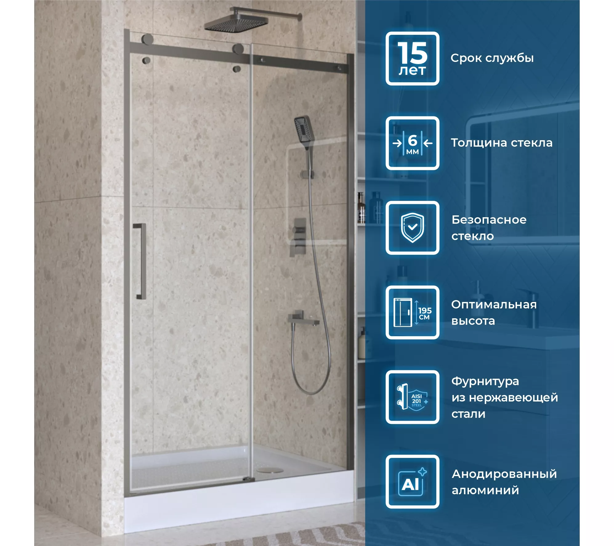 Коллекция предлагает четыре модели душевых ограждений на выбор: квадратные (A-2), прямоугольные (AH-1, AH-2) и дверь в нишу (BF-1). Все модели имеют оптимальную высоту 1950 мм. и представлены в популярных размерах, что позволяет найти идеальное решение для обеспечения комфорта и практичности душевой зоны.
