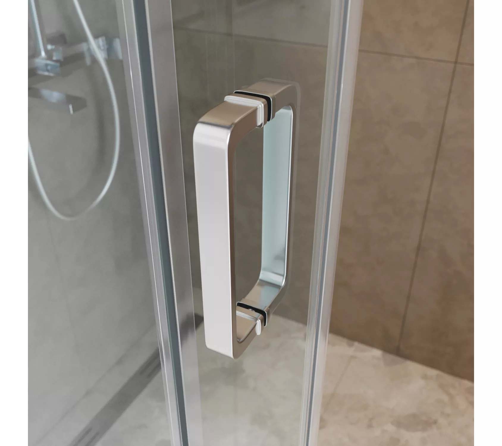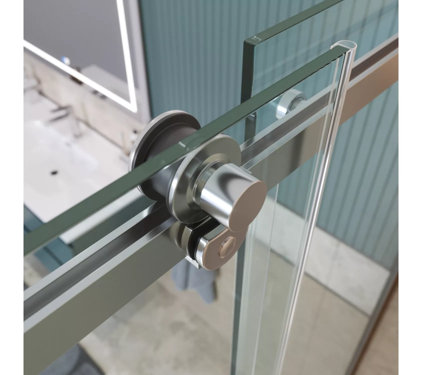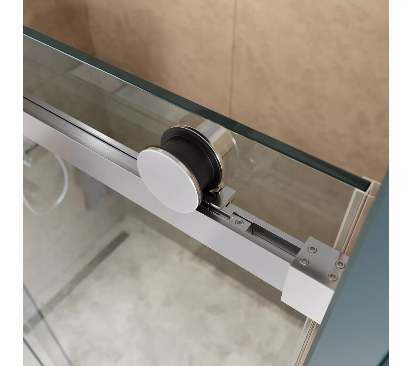 Коллекция сохраняет все преимущества минималистичного дизайна: минимум деталей, узкие профили и прозрачное стекло, которое не перегружает пространство, подчёркивая ощущение простора в ванной. Особая фишка — ролики увеличенного диаметра, обеспечивающие сверх плавное и бесшумное скольжение стеклянной панели без малейших усилий. Эти крупные элементы визуально доминируют, добавляя ограждению нотку надёжности и индустриальной эстетики в минималистичном стиле. Благодаря им ощущается лёгкость движения двери, усиливающая общее впечатление роскоши и стабильности, будто конструкция парит.