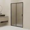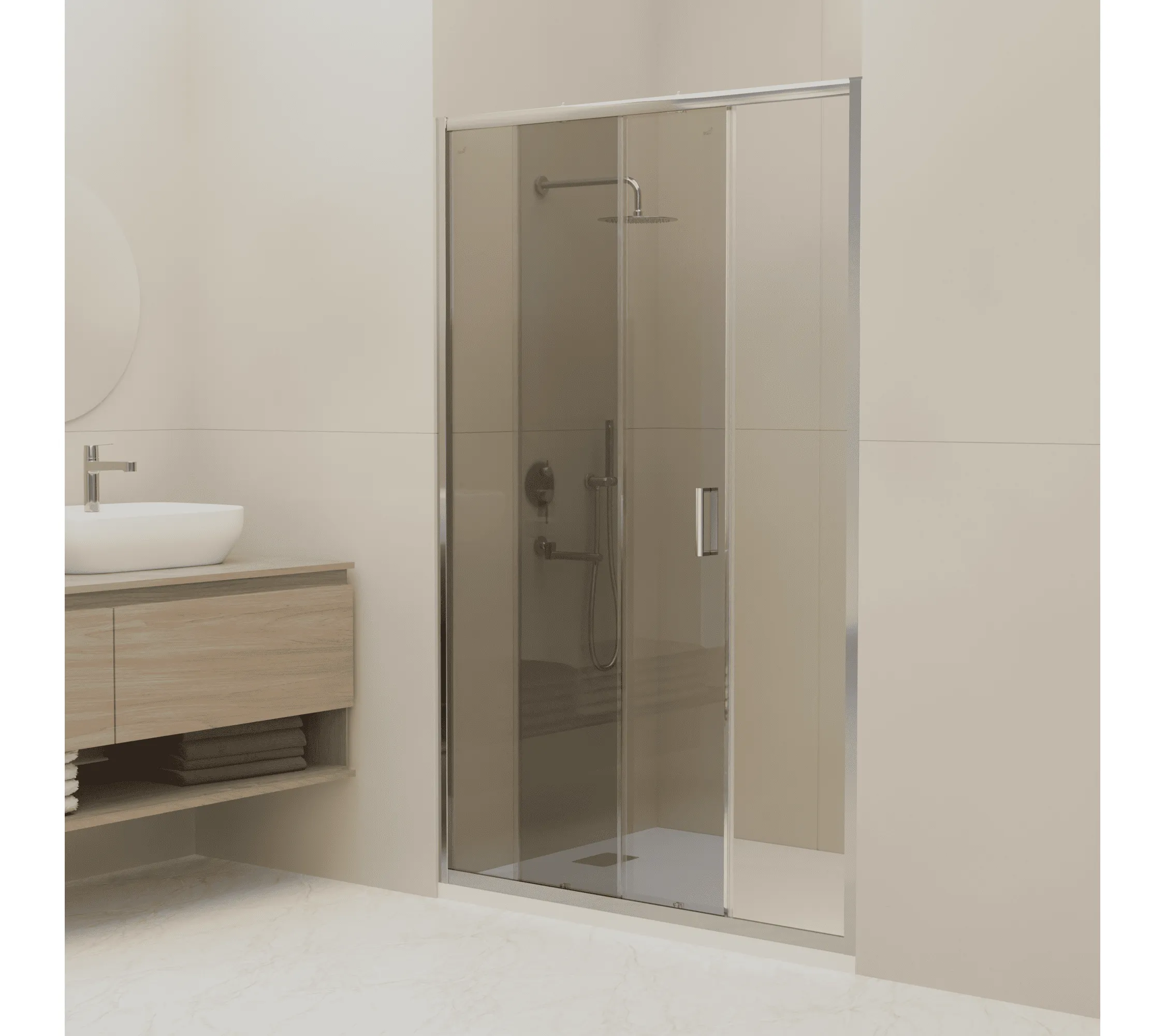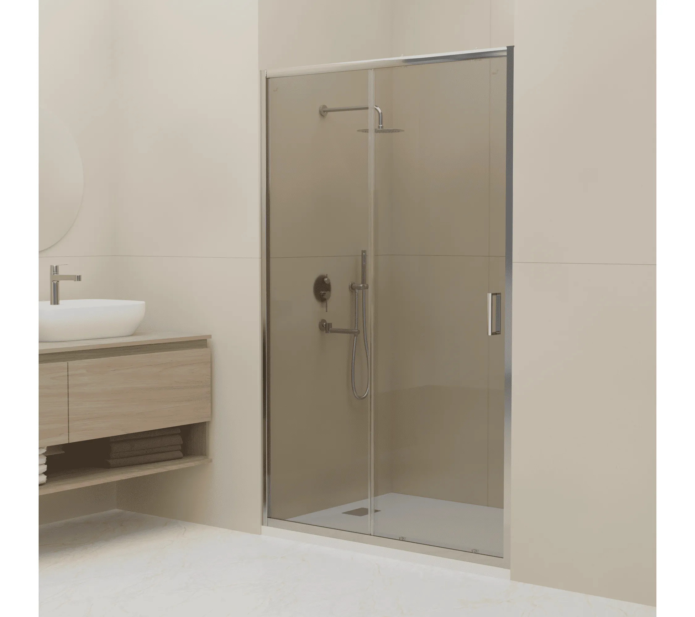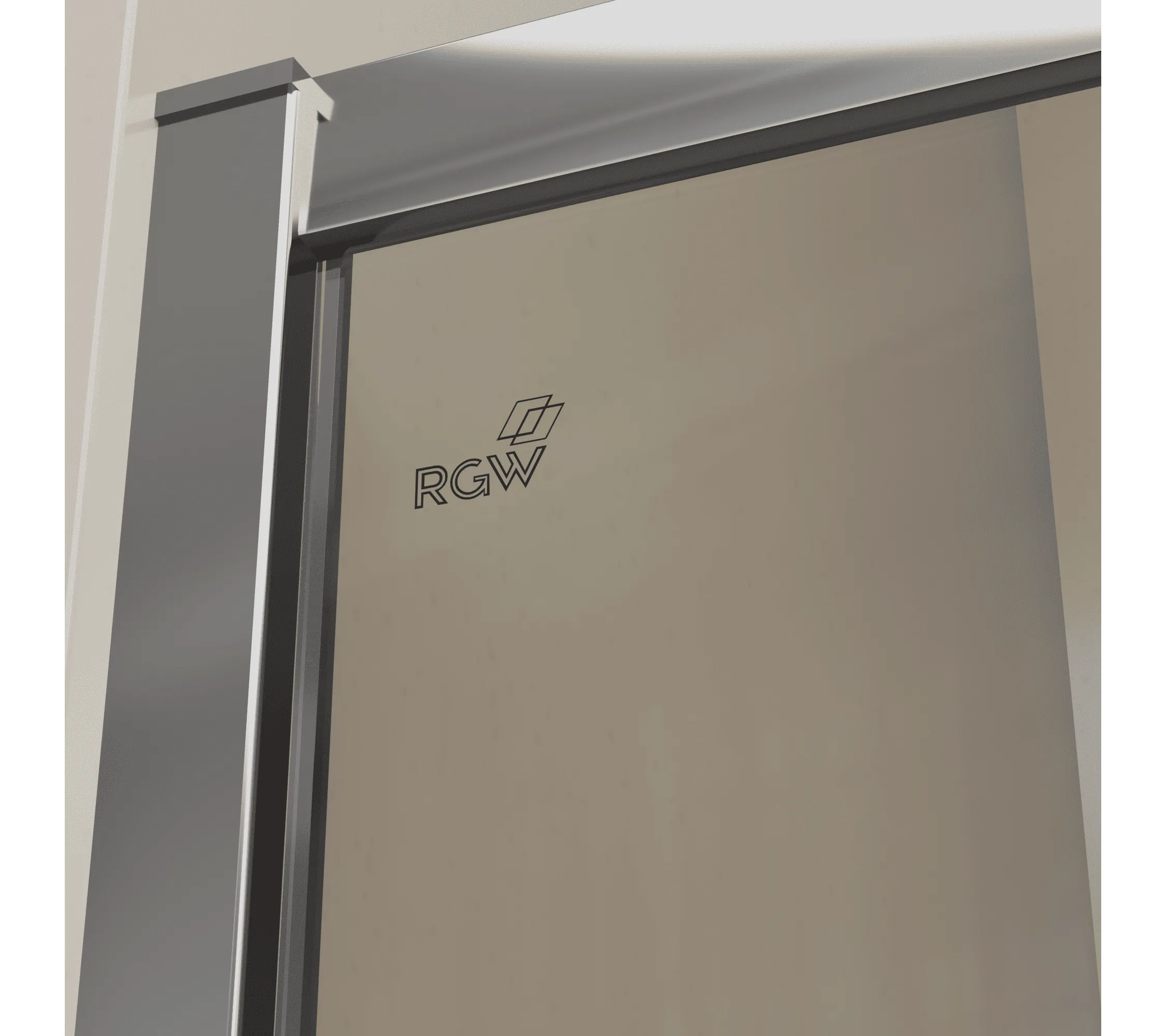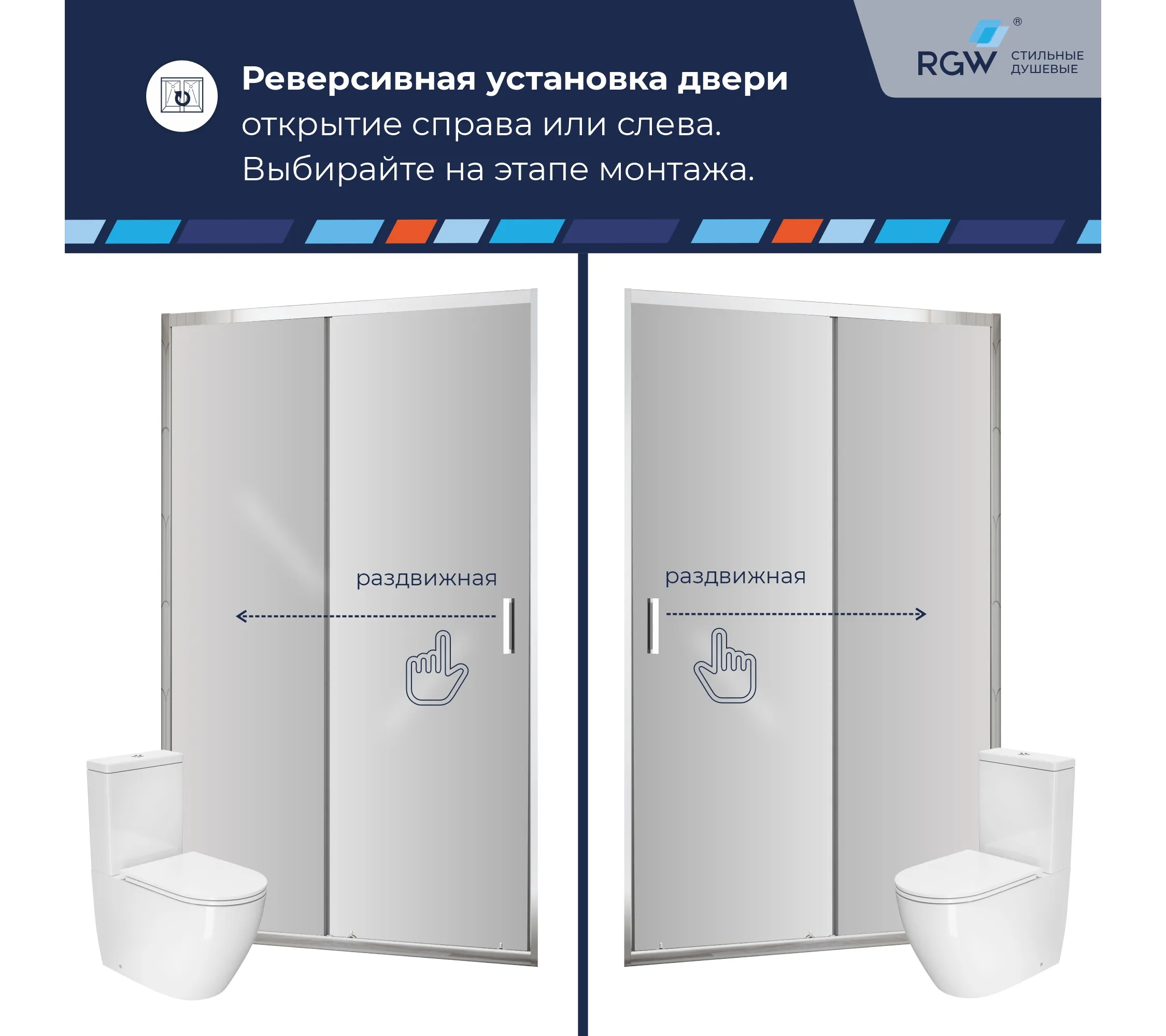 Душевая дверь, раздвижная, алюминиевый профиль в хромированной и черной отделке, пристенный профиль с регулировкой 15 мм, двойные ролики из ABS-пластика, закаленное стекло толщиной 6 мм, двойная цинковая ручка 145 мм, магнитные уплотнители из ПВХ. Логотип RGW на стекле. Инструкция, гарантийный талон и памятка входят в состав набора.
