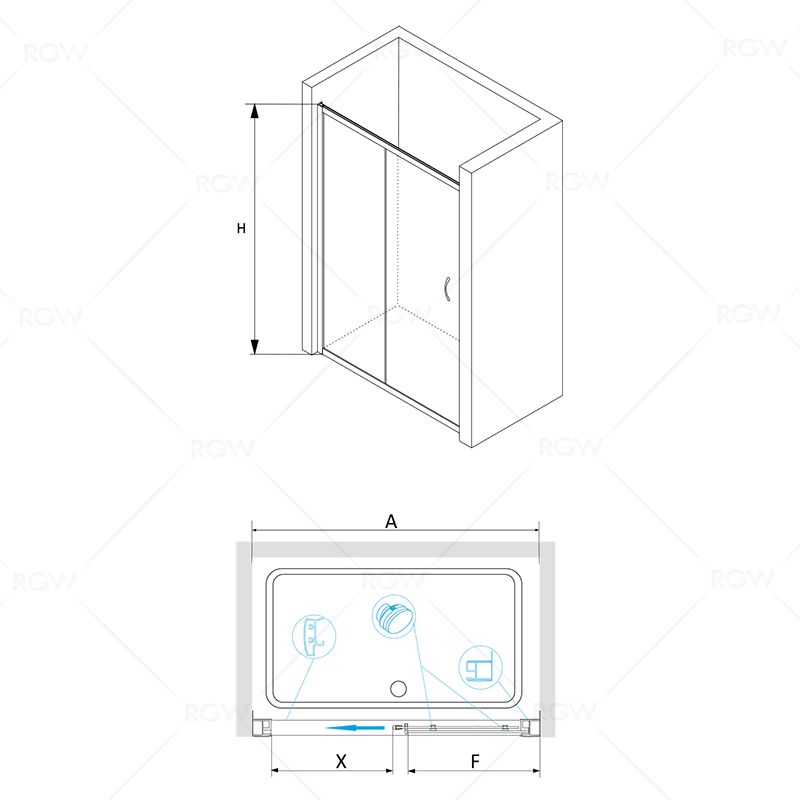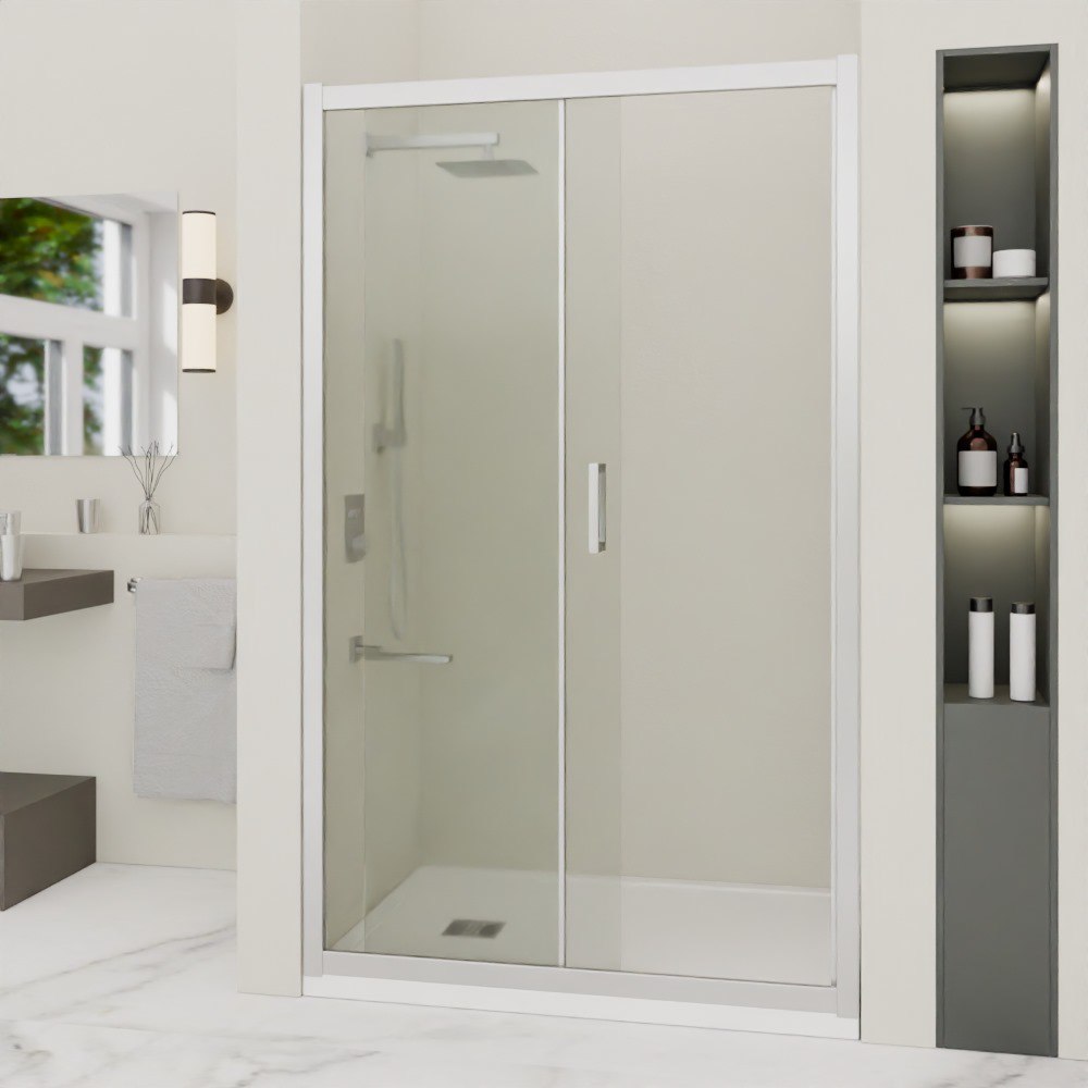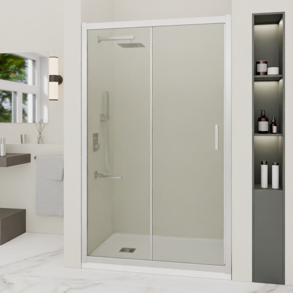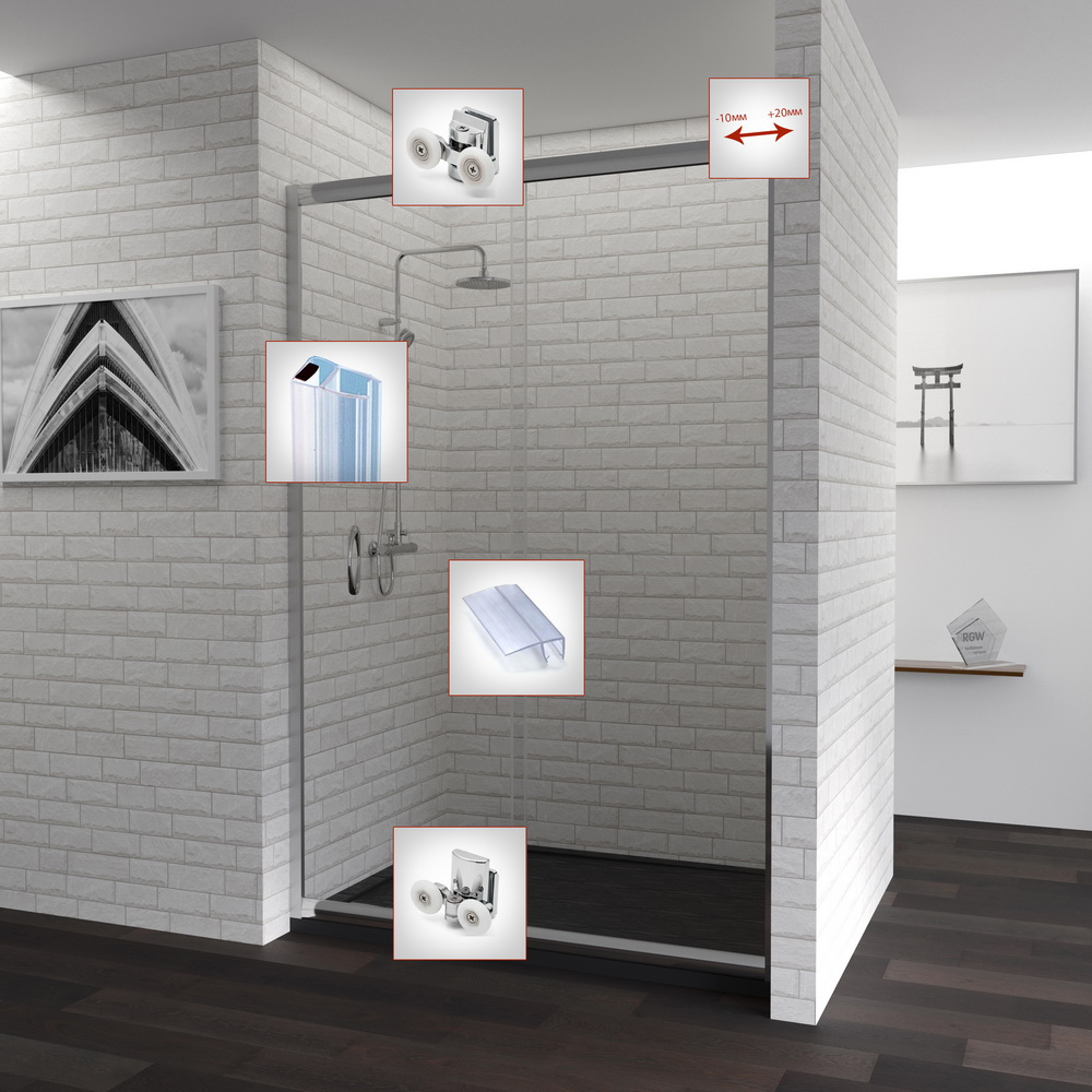 Душевая дверь состоит из 2-х секций, одно неподвижное стекло и раздвижная дверь от стены. Трап или поддон приобретается отдельно.