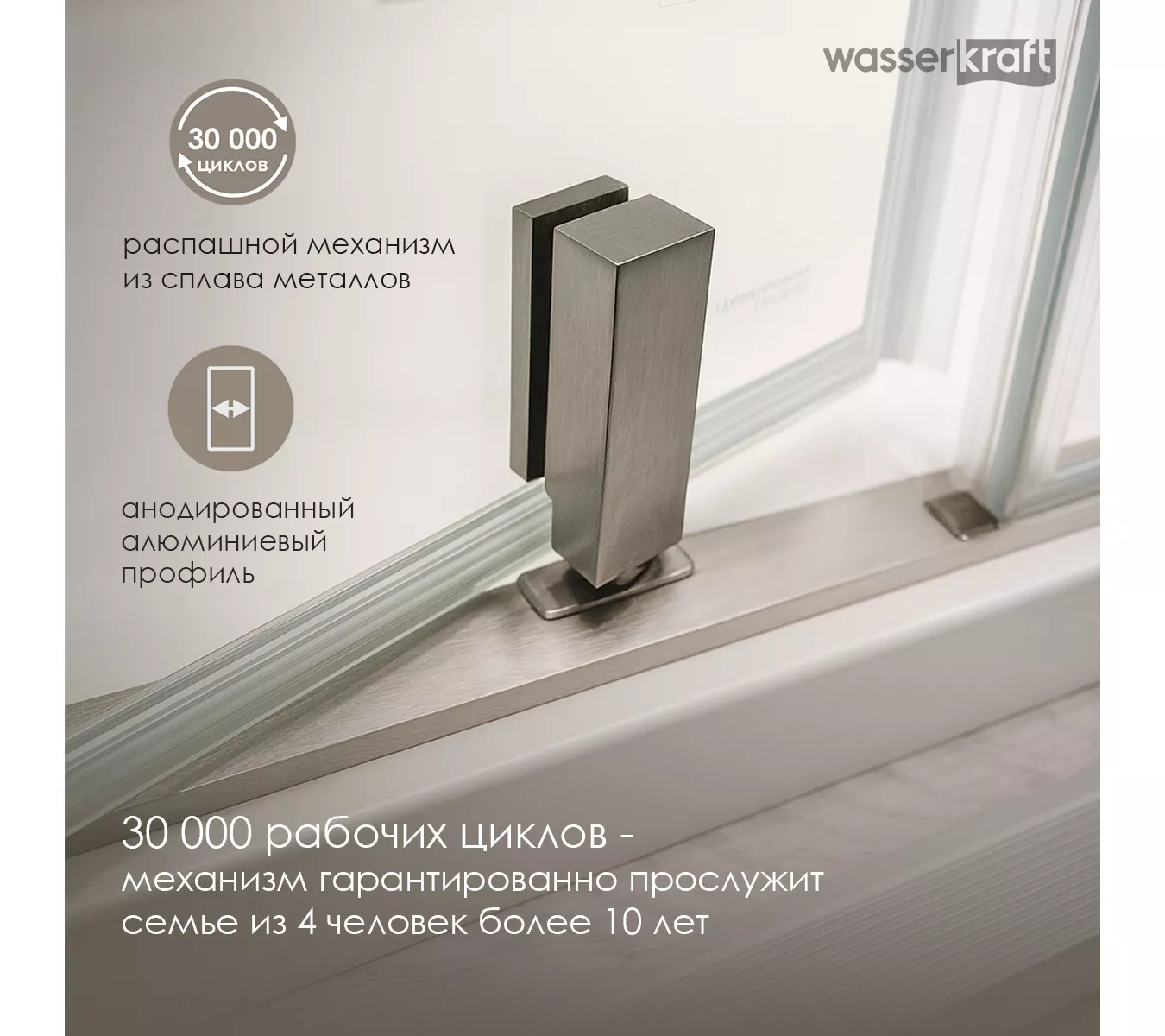 4) Распашной механизм из латуни - Механизм рассчитан минимум на 30 000 рабочих циклов. Это значит, что семья из четырех человек сможет пользоваться душевым уголком минимум 10 лет. Распашной механизм дает возможность широкого проема для входа внутрь душевого уголка.