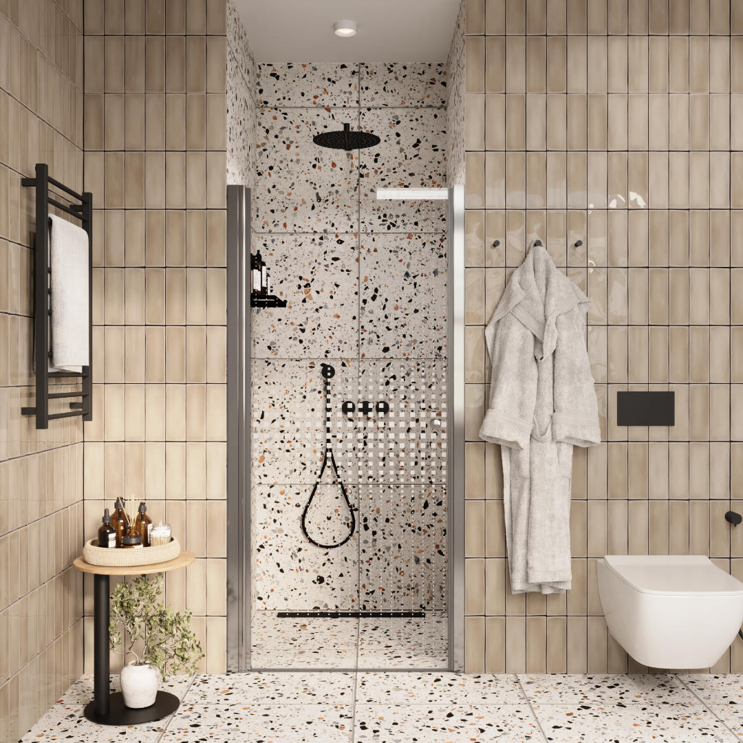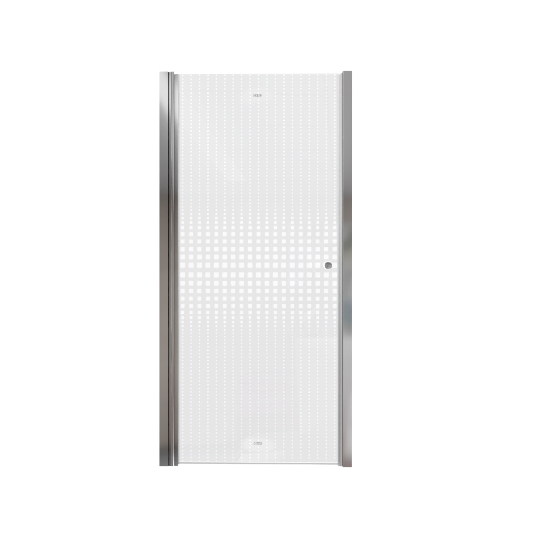 Распашная дверь образует вход комфортной ширины. Модель из прозрачного закаленного стекла (5 мм) с дизайнерским рисунком. Полотно устойчиво к случайным ударам. В случае битья, стекло рассыпается на множество мелких граней с тупыми концами.Алюминиевый полированный хромированный профиль не деформируется при высокой влажности и смене температуры. Хромированные петли и ручка устойчивы к образованию коррозии.Достоинства душевой двери:Защищает ванную комнату от брызг воды. Пол возле душевой зоны остается сухим, что снижает шансы поскользнуться после водных процедур.Душевая дверь помогает зонировать помещение на отдельные функциональные участки. Особенно это актуально для совмещенного санузла и небольших ванных комнат.Двери из стекла практичны, долговечны и гигиеничны. На стеклянной поверхности не скапливаются бактерии и грязь, полотно легко чистить.Дизайн двери дополнит стилистическую задумку оформления ванной.При правильном уходе душевая дверь долгие годы сохраняет эстетический внешний вид. Для чистки необходимо использовать мягкие губки и салфетки, специальные жидкие чистящие средства.Нельзя использовать жесткие губки и абразивные порошки, которые оставляют мелкие царапины. Как результат, в них скапливается грязь и размножаются бактерии. Поэтому важно правильно чистить стеклянные поверхности.