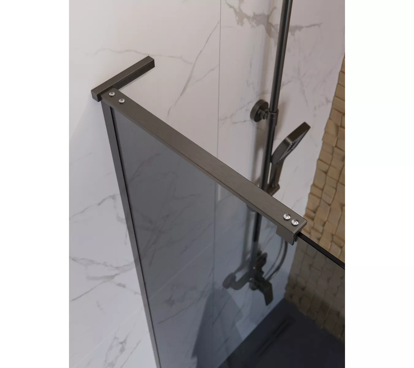 ● L-образный кронштейн сохраняет минималистичный вид и не загромождает пространство, оставаясь практически незаметным в душевой зоне.