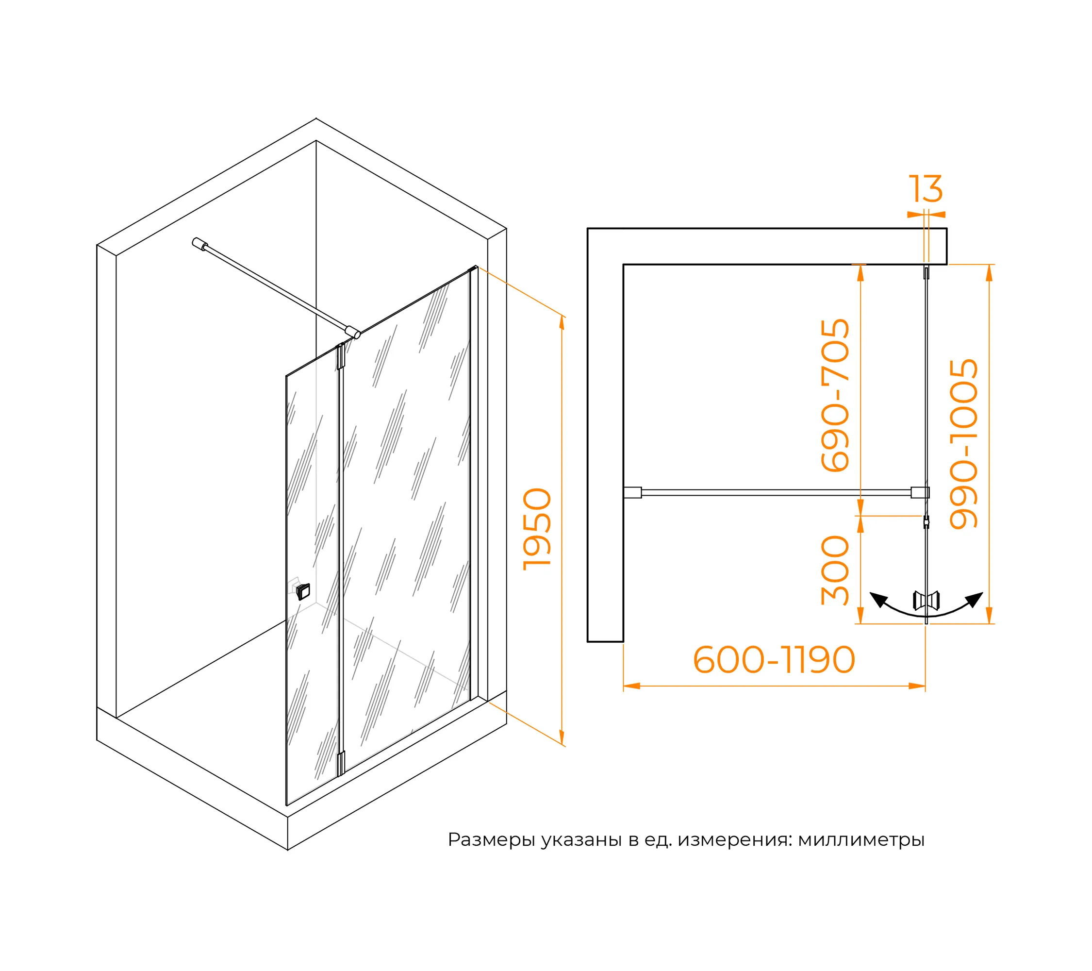 Душевая перегородка состоит из стационарного полотна и полотна с поворотной маятниковой частью - 300 мм. Стационарное стекольное полотно крепится к стене алюминиевым профилем с декоративной заглушкой. Подвижное полотно закреплено стальной маятниковой петлей с ходом 180 градусов.Перегородка выпускается с фурнитурой в 3-х вариантах:хром/черный/золото brush.