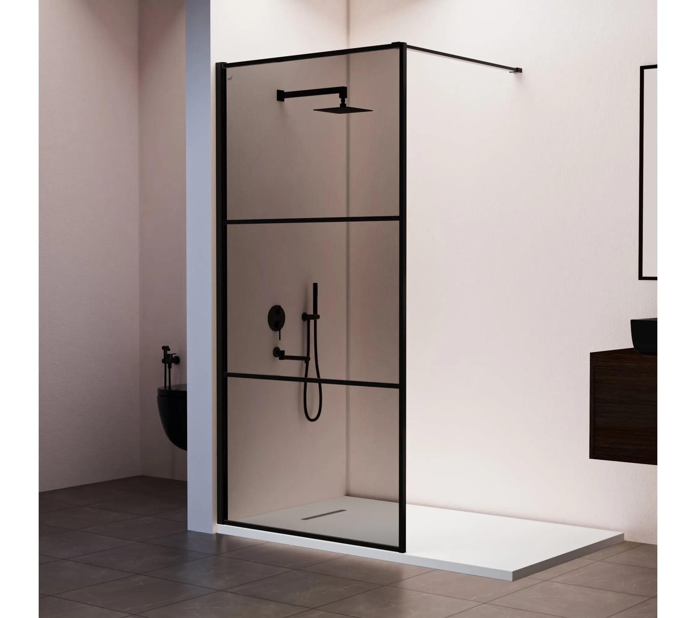 WA-09Модели представлены в трендовых цветовых решениях профиля: строгий чёрный и благородный золото браш.Разнообразные комбинации исполнения стекла:Ribbed Line (прозрачное + ребристое)ПрозрачноеТонированноеВысокопрочное премиальное закалённое стекло толщиной 8 мм, усиленный пристенный профиль ALUSTRONG MAX с антикоррозийной защитой и обрамление профилем по периметру каждого стекольного полотна (состоит из 3-х стекольных полотен) обеспечивают высокую надёжность и привлекательный внешний вид.