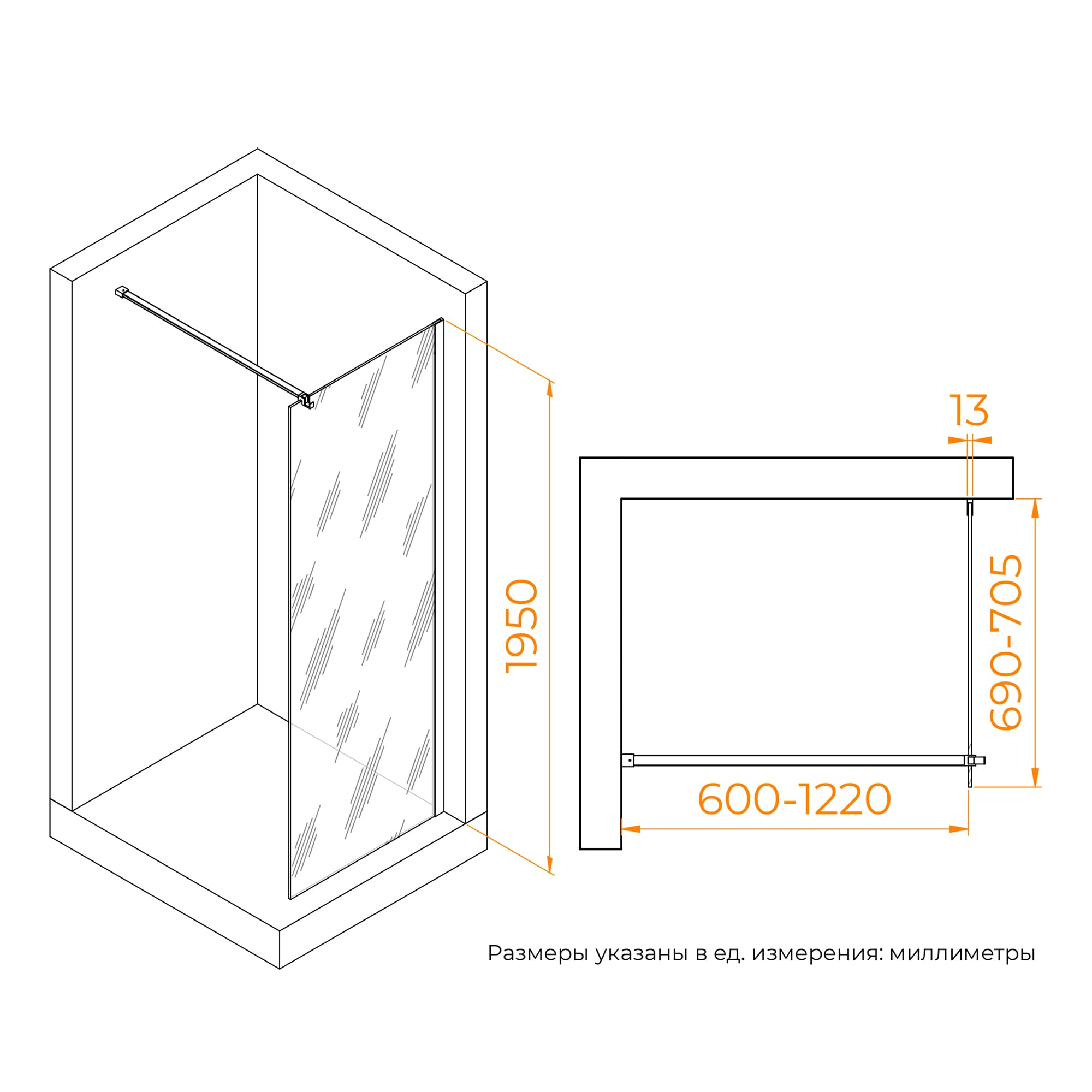 Стеклянная душевая перегородка с крючком высотой 1950 мм эффективна при установке на подиум для людей с высоким ростом, может также установиться на пол с плоским душевым поддоном или без дополнительной основы, на керамическую плитку с душевым трапом.