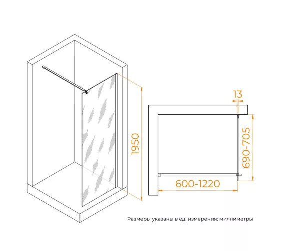 Стеклянная душевая перегородка с крючком высотой 1950 мм эффективна при установке на подиум для людей с высоким ростом, может также установиться на пол с плоским душевым поддоном или без дополнительной основы, на керамическую плитку с душевым трапом.