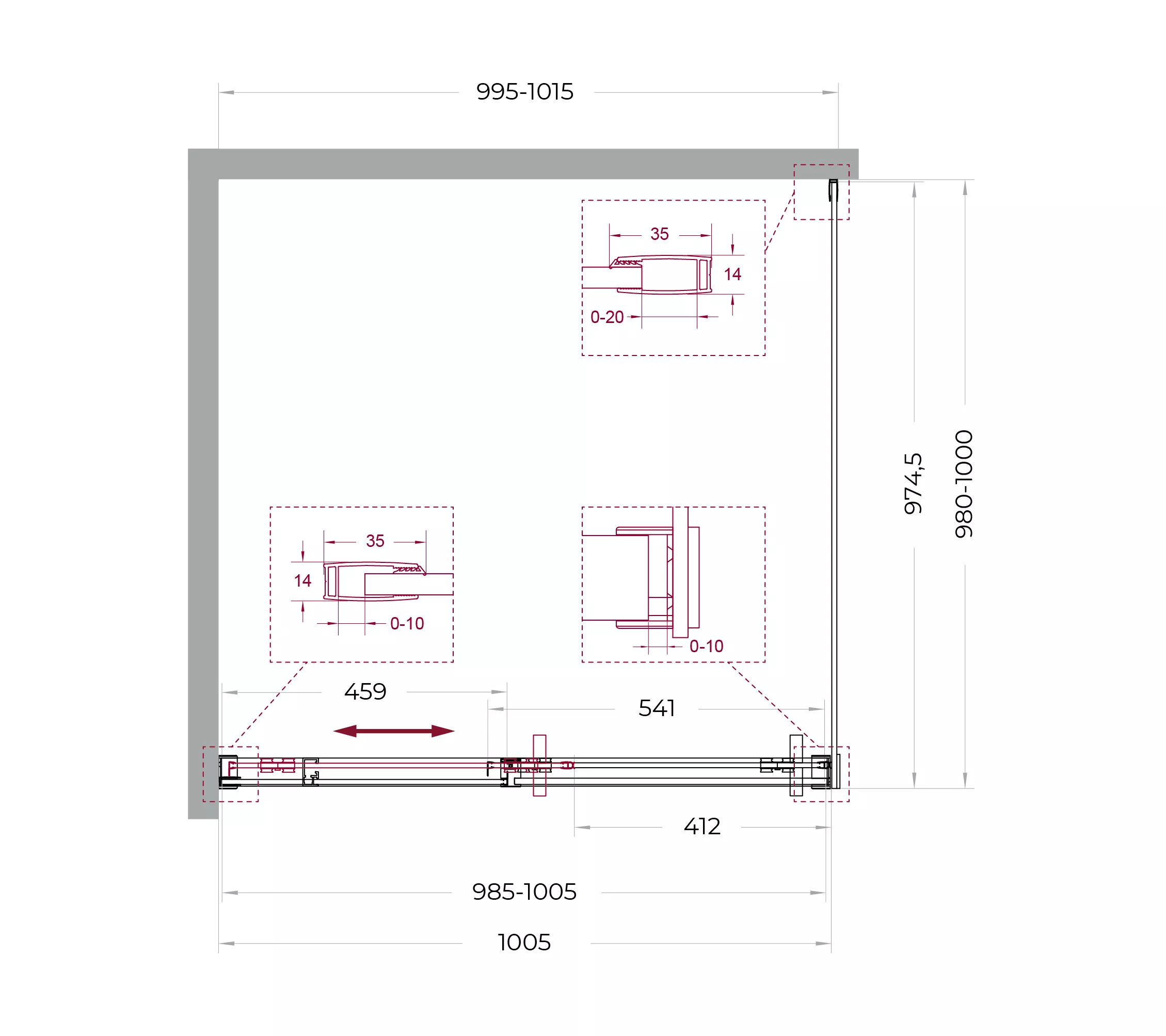 ● Система подвески: Двойные навесные ролики из нержавеющей стали с держателем стекла обеспечивают плавное движение створки, ее устойчивость и отсутствие перекосов.