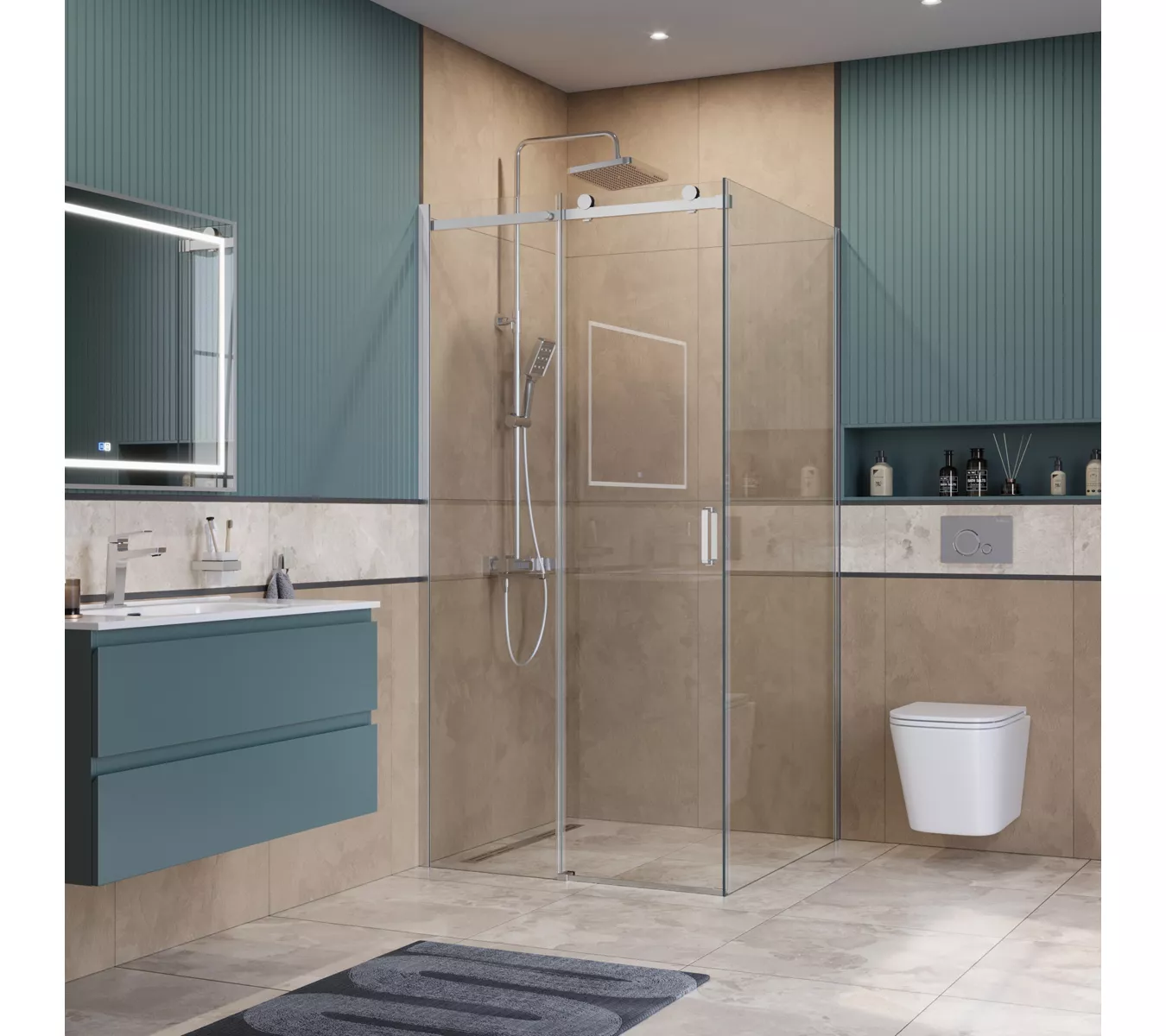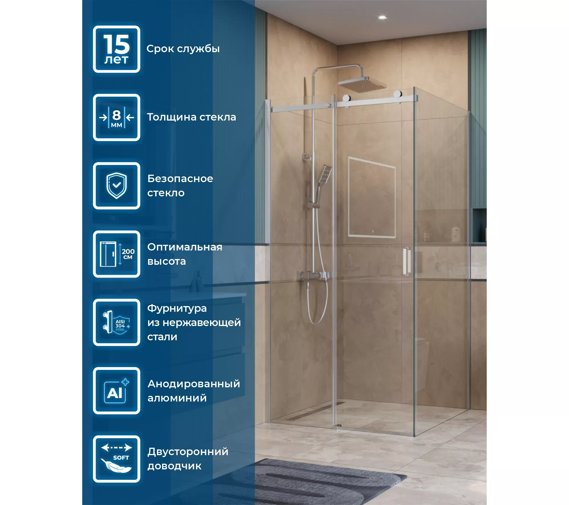 ● Коллекция предлагает три конфигурации, идеально подходящие для различных планировок ванных комнат: квадратную (A-1), прямоугольную (AH-1) и дверь в нишу (BF-1). Все они имеют высоту 2000 мм и доступны в наиболее востребованных размерах.