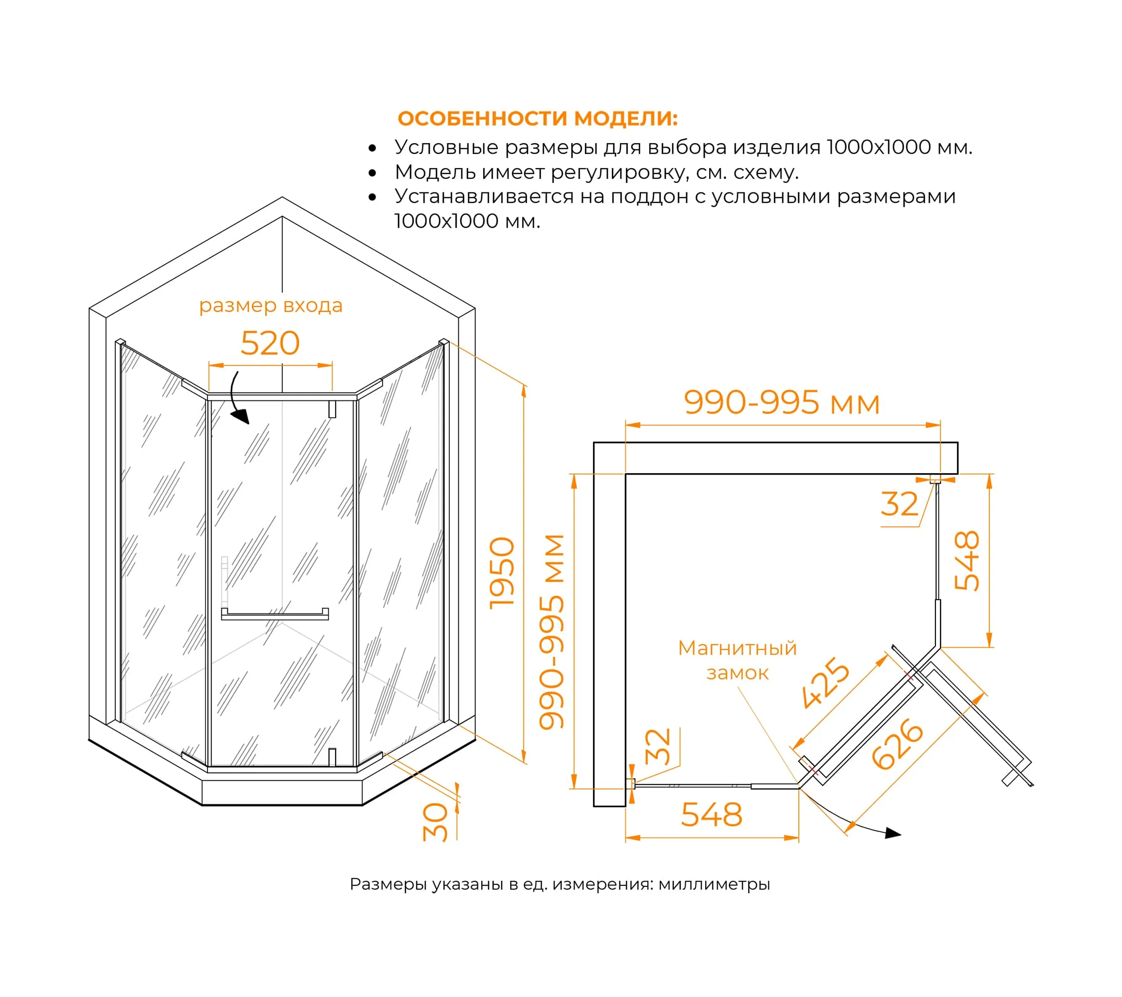 Душевой угол трапеция с распашной дверью. Трап или поддон приобретается отдельно.