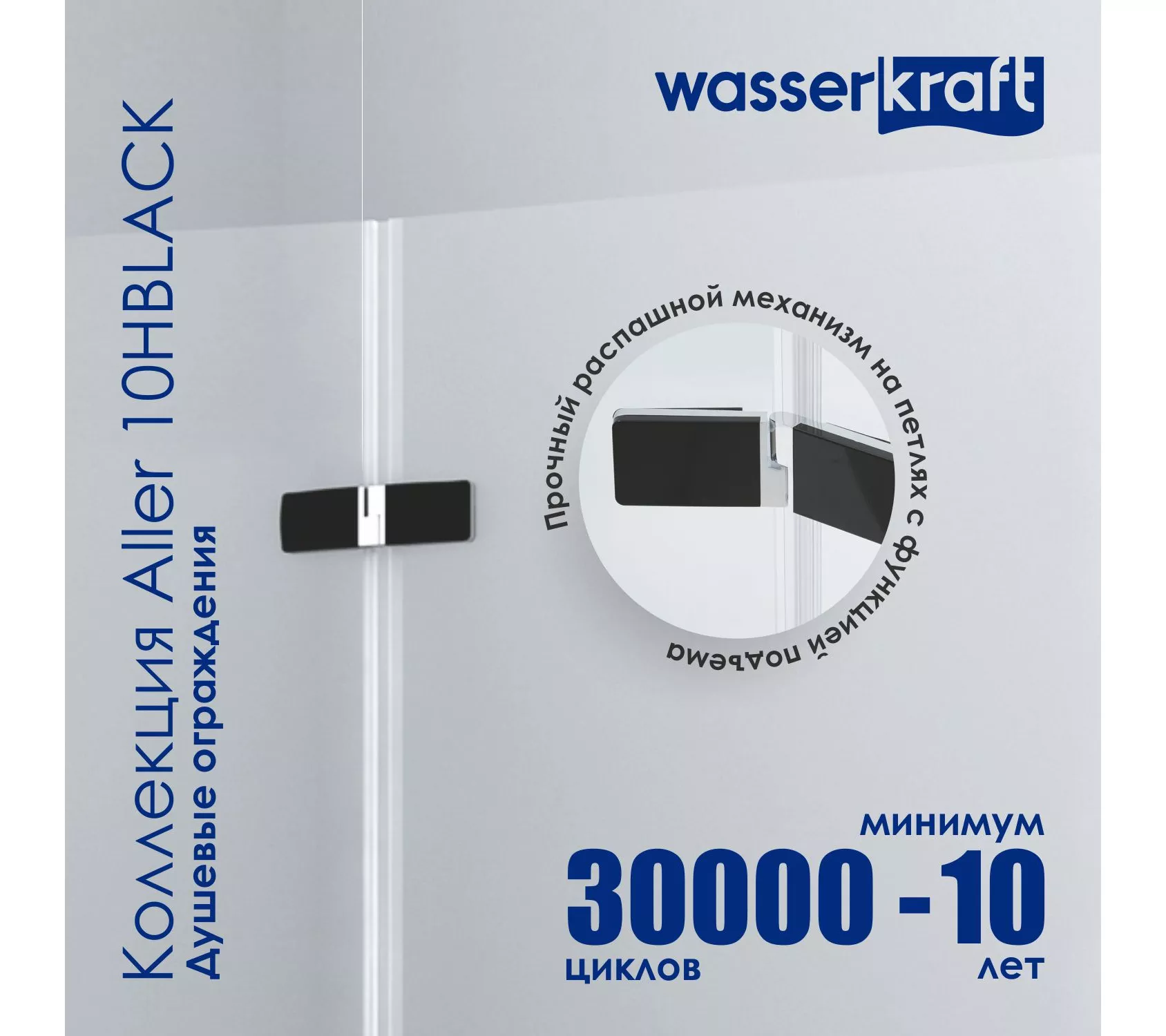 6) Прочный распашной механизм Механизм рассчитан минимум на 30 000 рабочих циклов. Это значит, что семья из четырех человек сможет пользоваться душевым уголком минимум 10 лет. Конструкция оборудована специальным подъемным механизмом. Благодаря этому двери душевого уголка приподнимаются при открытии. Это необходимо для бесшумного открывания/закрывания двери и долгого срока службы силиконовых уплотнителей двери.