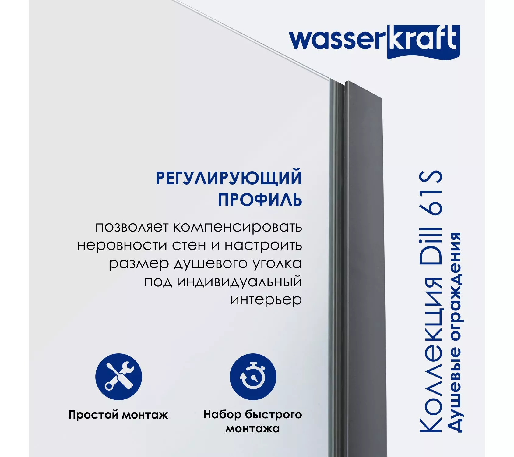 7) Регулирующий профиль до 6 мм Возможность регулировки бокового профиля позволяет компенсировать неровности стен и настроить размер душевого уголка под индивидуальный интерьер.