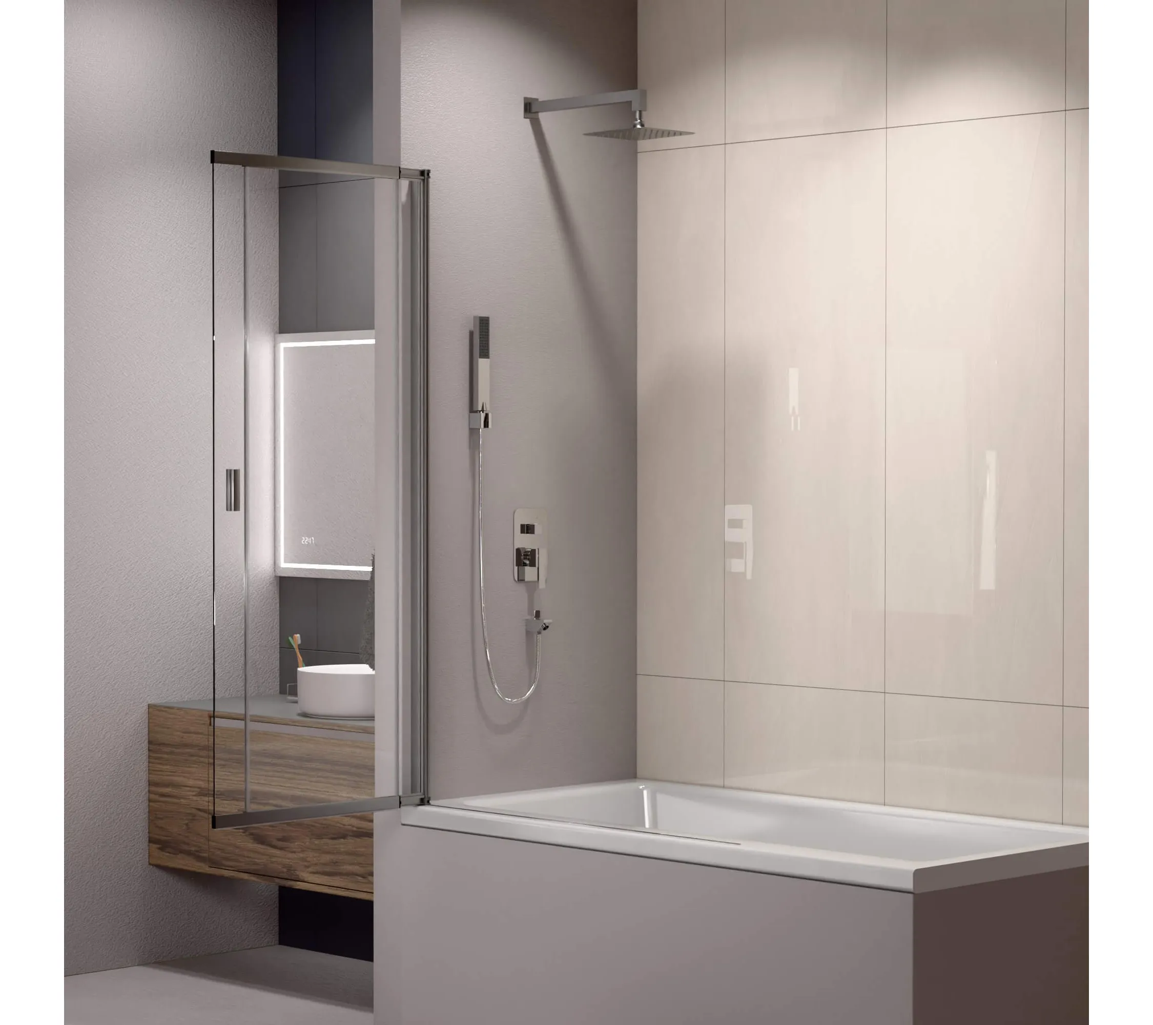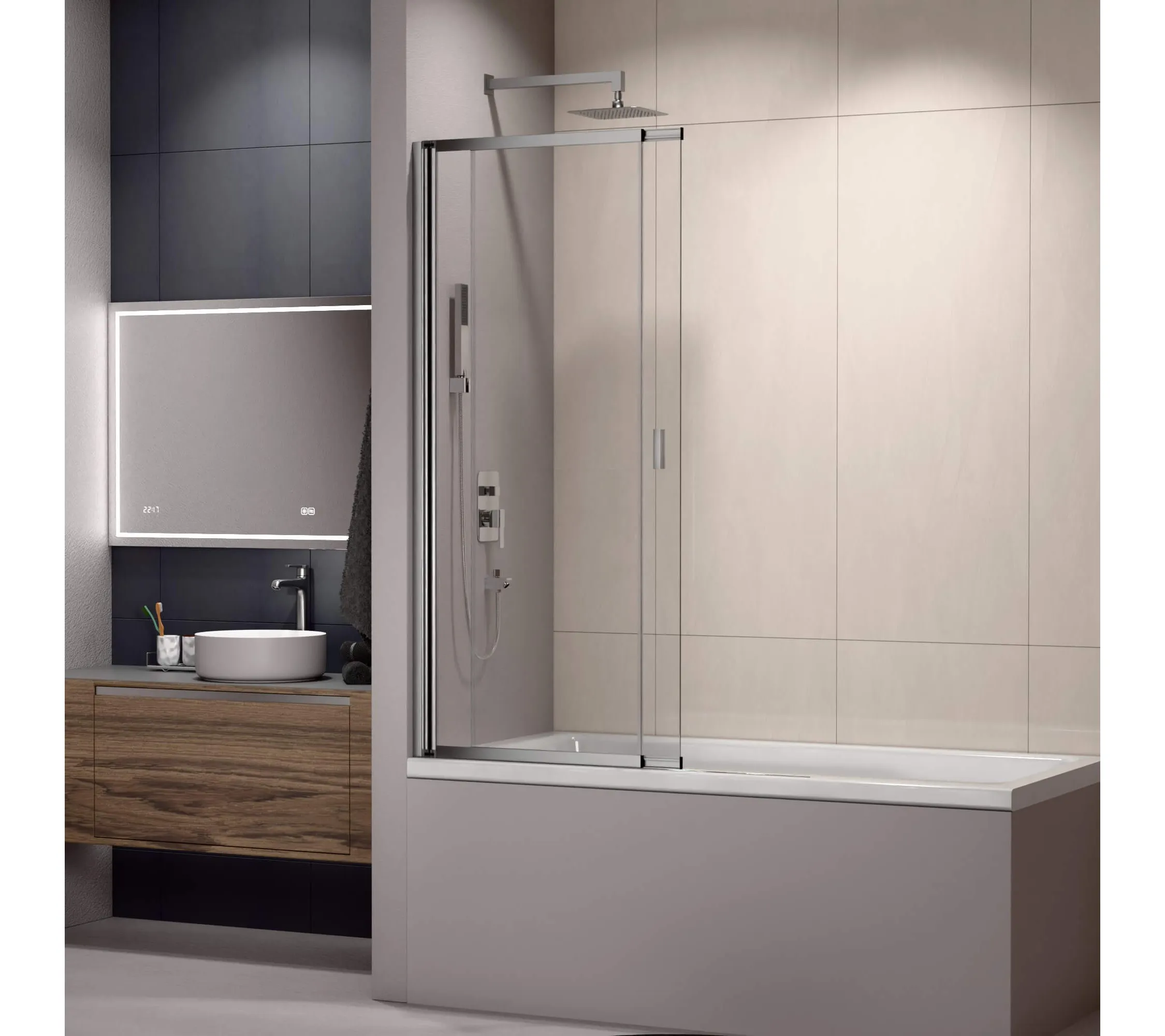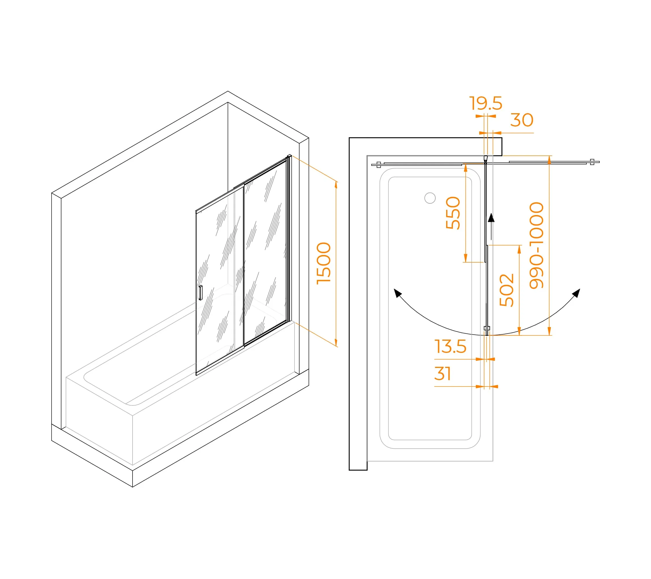Шторка на ванну, сдвижная дверь маятниковая. Толщина закаленного, безопасного стекла 4 мм. Стекло сдвигается от 600 мм до 1000 мм. В комплекте порог душевого ограждения.