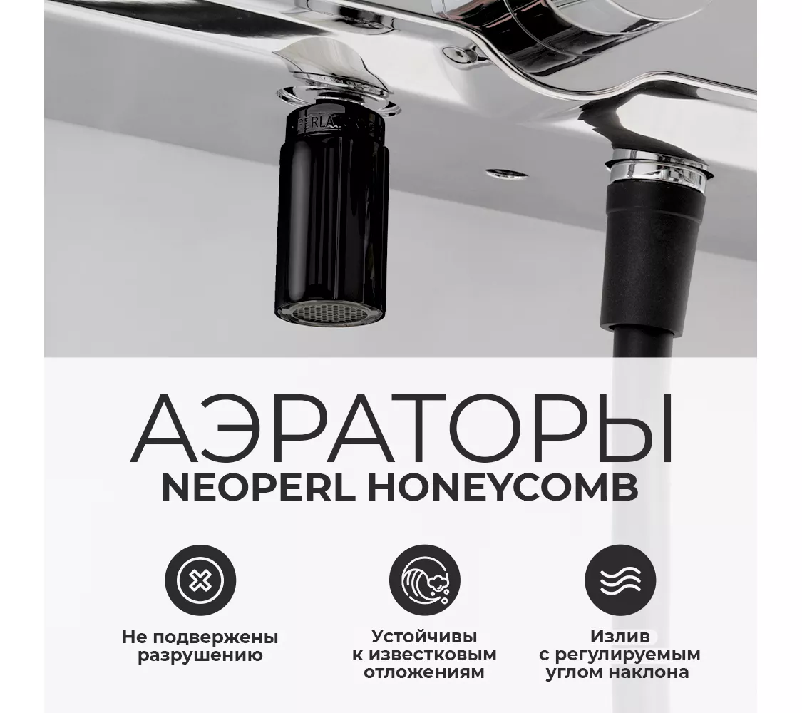 Встроенный пластиковый аэратор Neoperl HONEYCOMB (Германия) с регулируемым углом наклона струи.