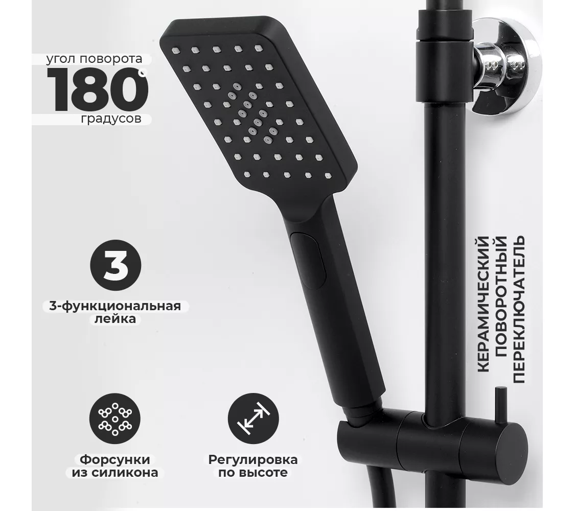 Дополнительно: Душевая насадка для комплекта производится из ABS-пластика. Форсунки из силикона с системой защиты от известковых отложений. Насадка крепится к штанге при помощи шарнирного соединителя, внутрь которого встроен сетчатый аэратор для равномерного распределения воды. Также шарнирный соединитель позволяет менять угол наклона душевой насадки от 0 до 22 градусов.