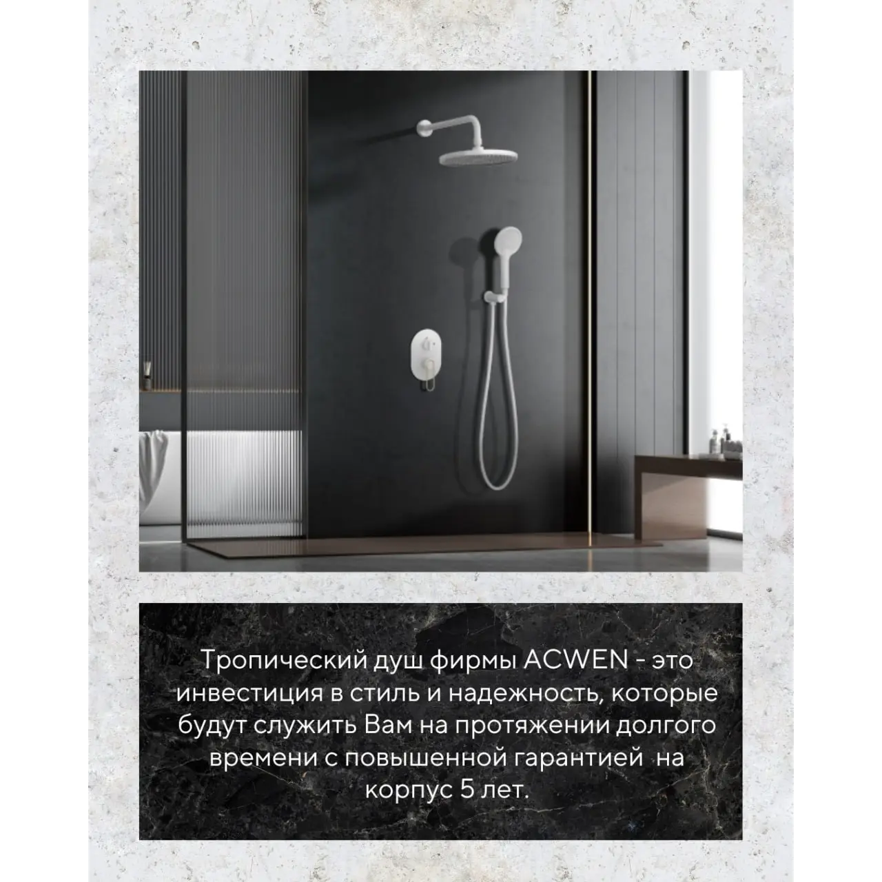 Тропический душ фирмы ACWEN - это инвестиция в стиль и надежность, которые будут служить Вам на протяжении долгого времени с повышенной гарантией на корпус смесителя 5 лет.