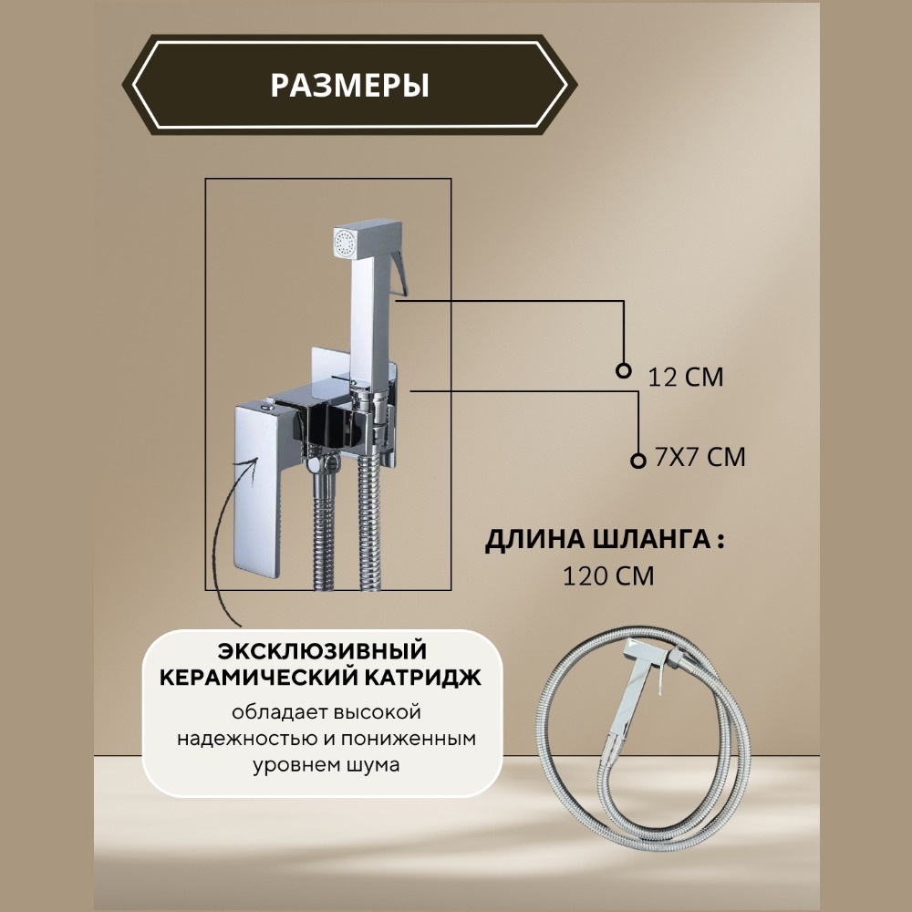 Керамический картридж – обладает высокой надежностью и пониженным уровнем шума. Также в комплект поставки входит: душевой шланг 120 см, гигиеническая лейка.
