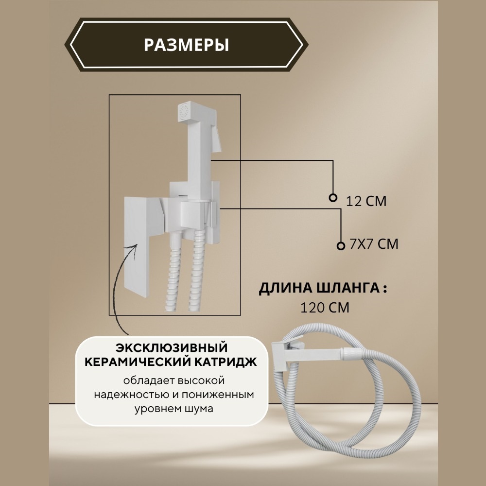 Керамический картридж – обладает высокой надежностью и пониженным уровнем шума. Также в комплект поставки входит: душевой шланг 120 см, гигиеническая лейка.
