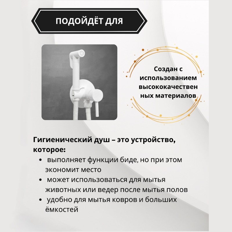 Компактный и элегантный дизайн лейки для гигиенического душа отлично сочетается с любым интерьером ванной комнаты. Гигиенический душ – это устройство, которое выполняет функции биде, но при этом экономит место, если ваша ванная комната не может его вместить.