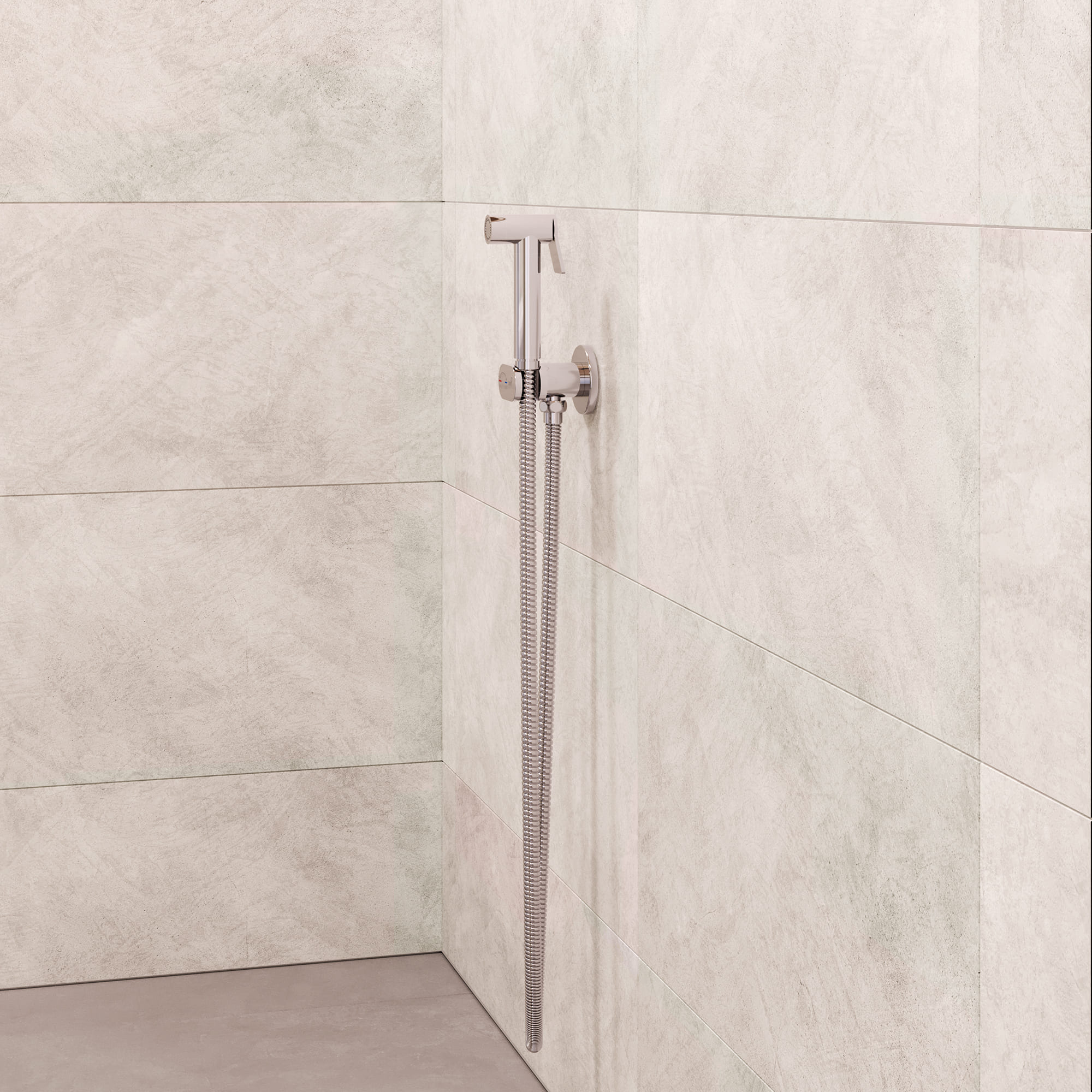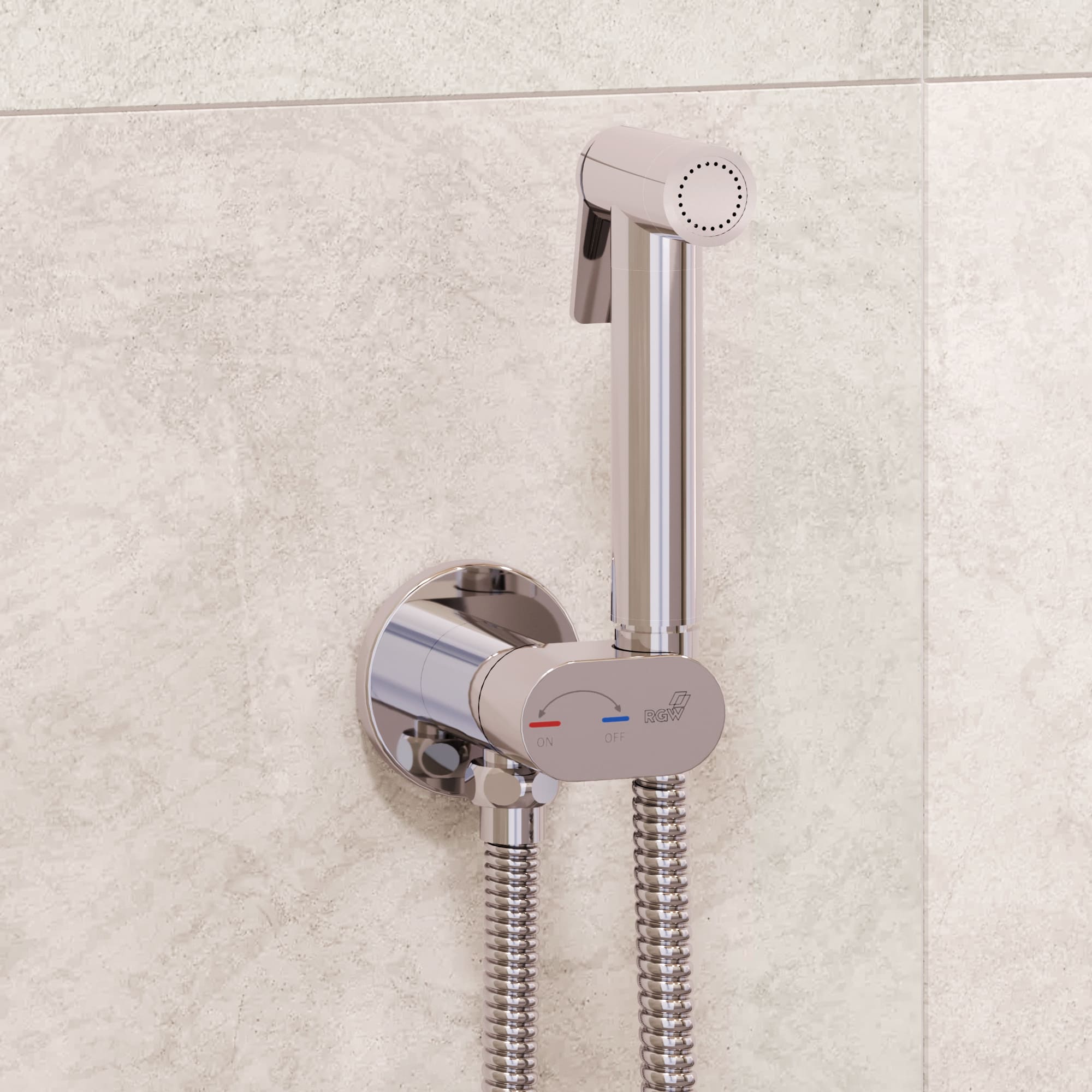 Смеситель круглой формы с гигиенической лейкой со средней струей. Струя из гигиенического душа выходит плотная, упругая и направленная. Она может быть как мягкой рассеянной, так и интенсивной, в зависимости от выбранного напора воды. Её температура легко регулируется от прохладной до комфортно тёплой. Вода подаётся равномерно, без пульсаций, обеспечивая точное и аккуратное очищение. Форма струи в этой модели узконаправленная, что делает её удобной для гигиенических процедур.