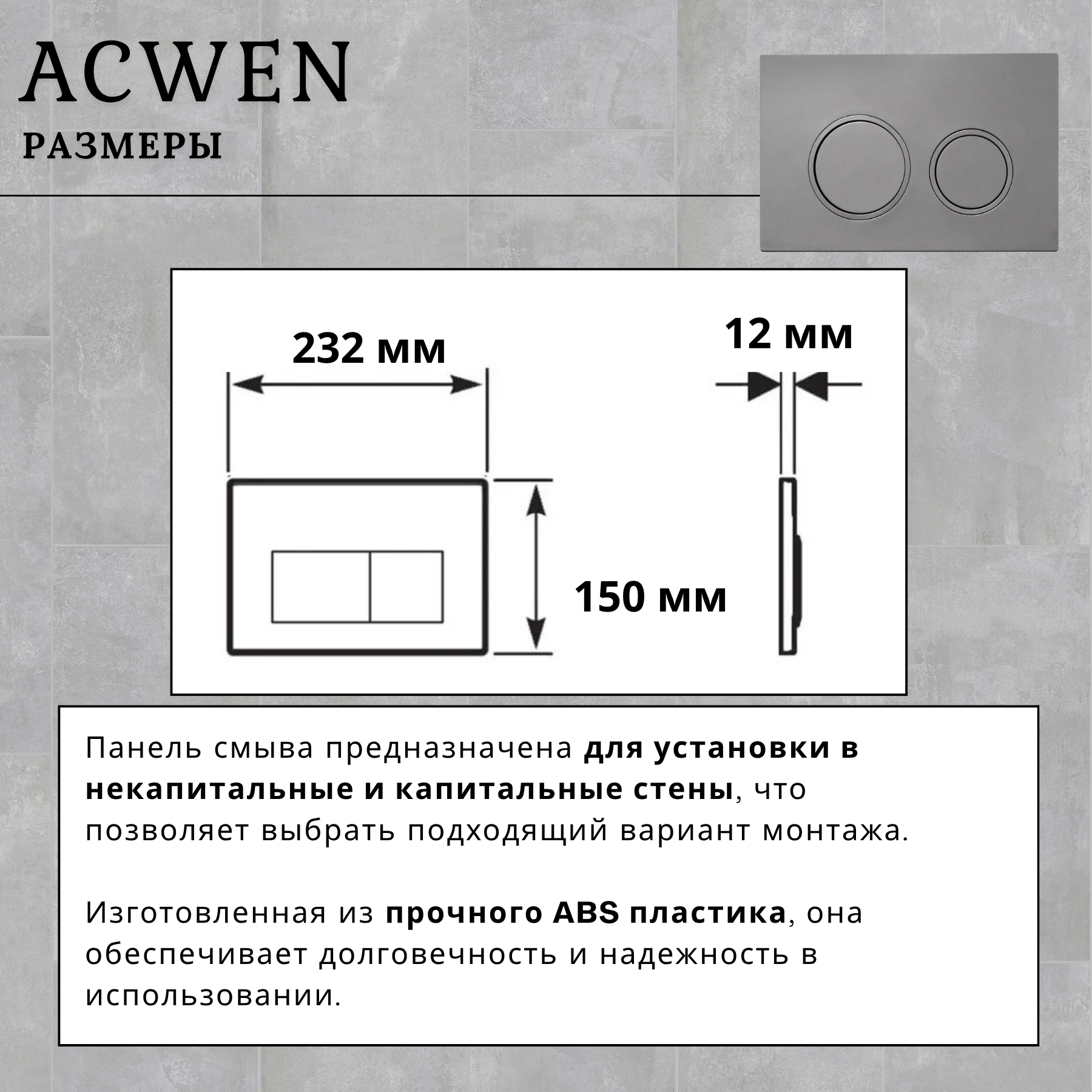 Выбирая панель смыва ACWEN с двумя клавишами , вы получаете стильное и практичное решение для управления смывом унитаза, которое обеспечит комфорт и гигиеничность использования.