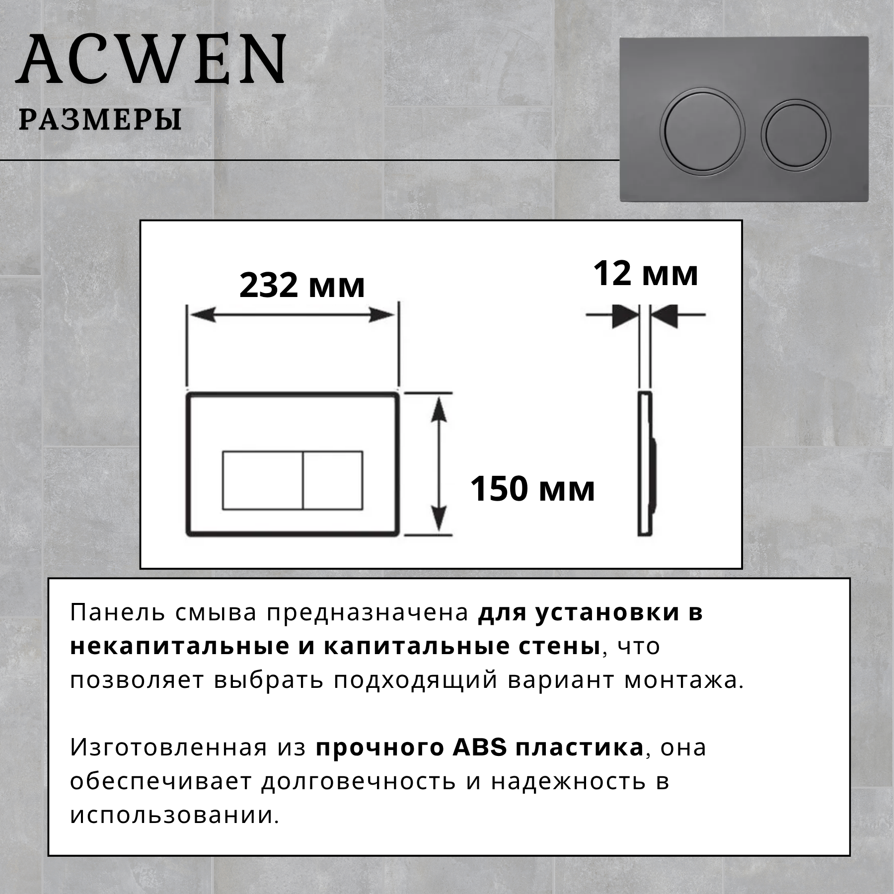 Панель смыва ACWEN с двумя клавишами  представляет собой стильное и функциональное решение для управления смывом унитаза. Изготовленная из прочного ABS пластика, она обеспечивает долговечность и надежность в использовании.