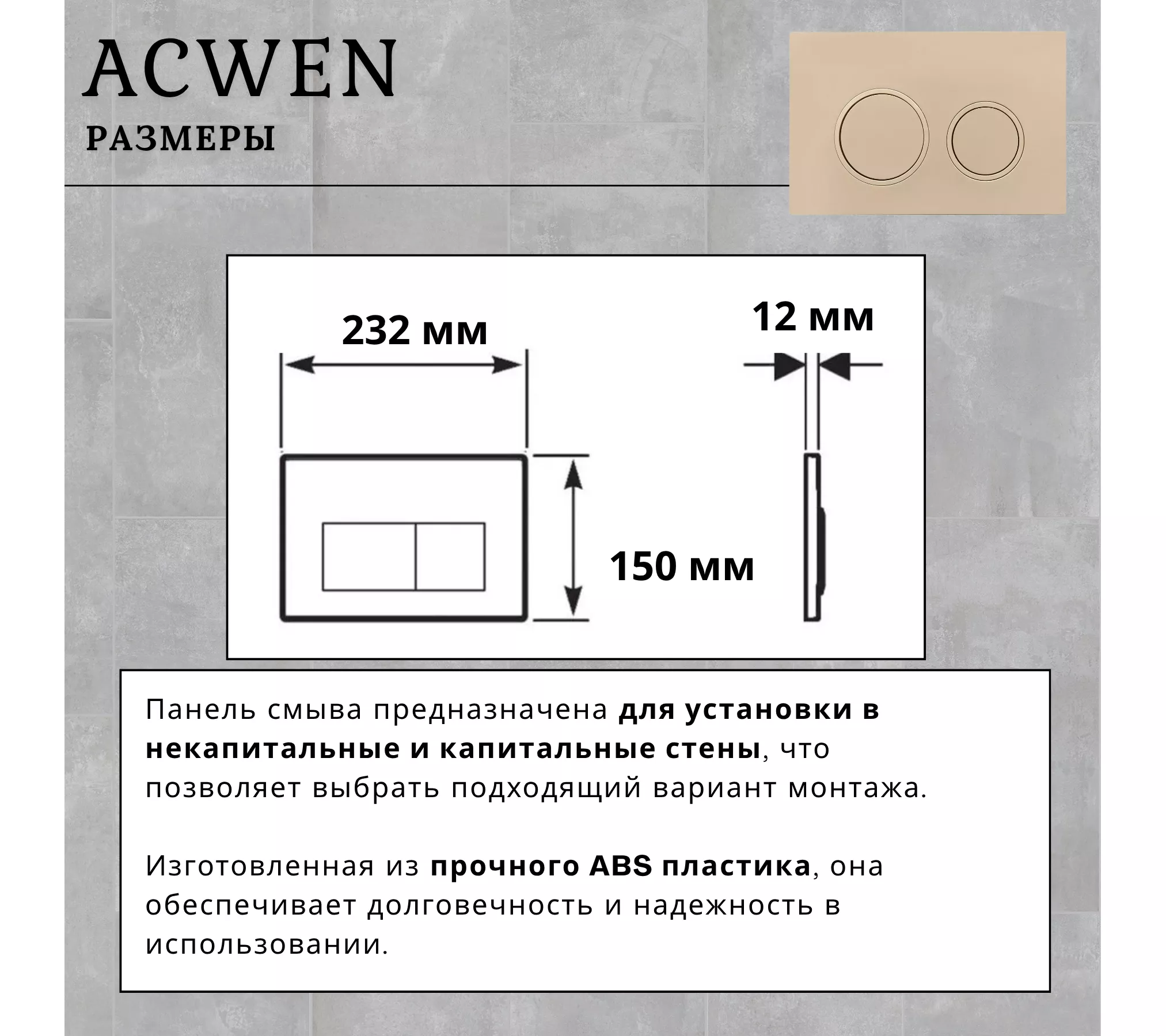 Панель смыва ACWEN с двумя клавишами  представляет собой стильное и функциональное решение для управления смывом унитаза. Изготовленная из прочного ABS пластика, она обеспечивает долговечность и надежность в использовании.