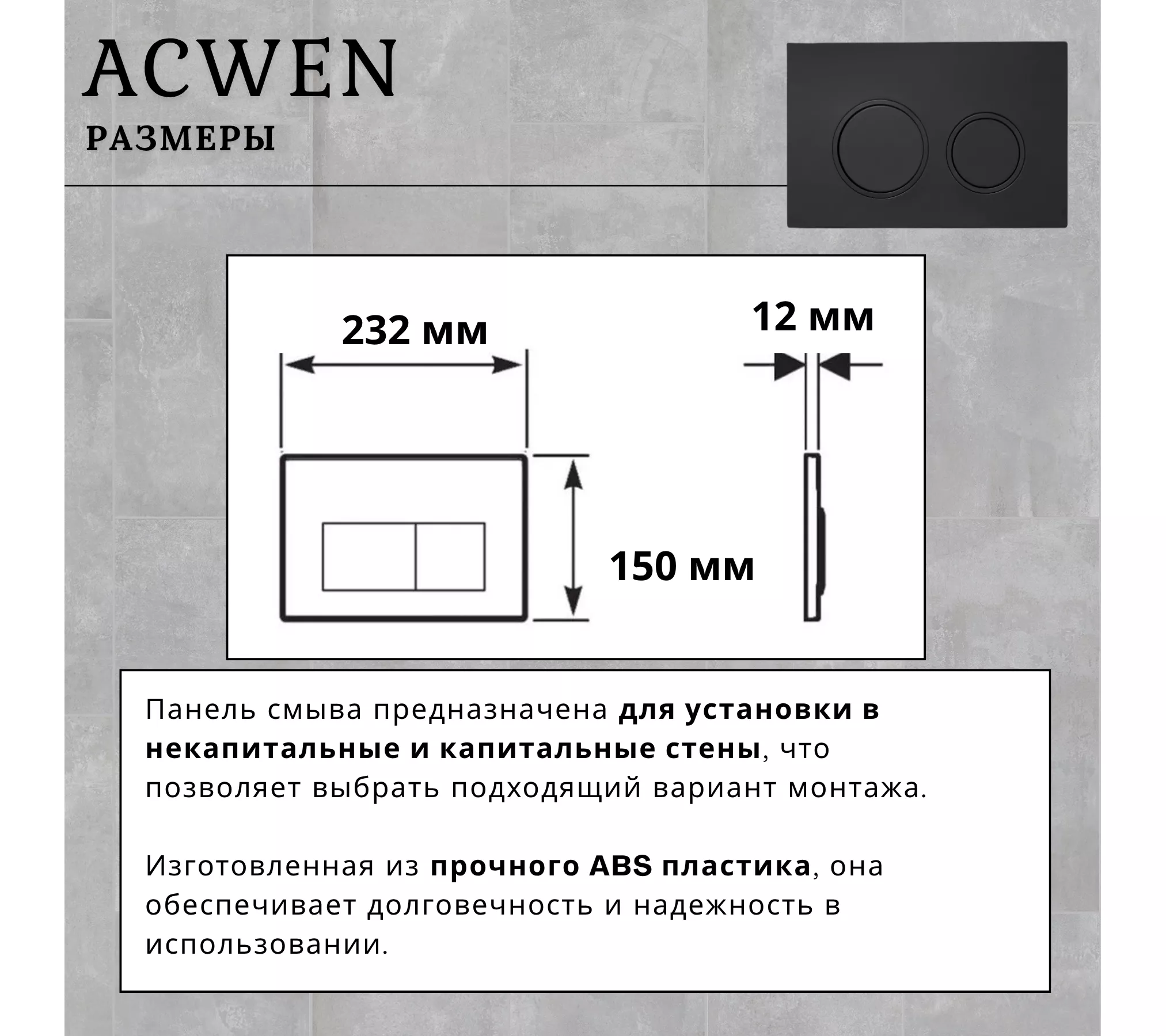 Панель смыва ACWEN с двумя клавишами  представляет собой стильное и функциональное решение для управления смывом унитаза. Изготовленная из прочного ABS пластика, она обеспечивает долговечность и надежность в использовании.