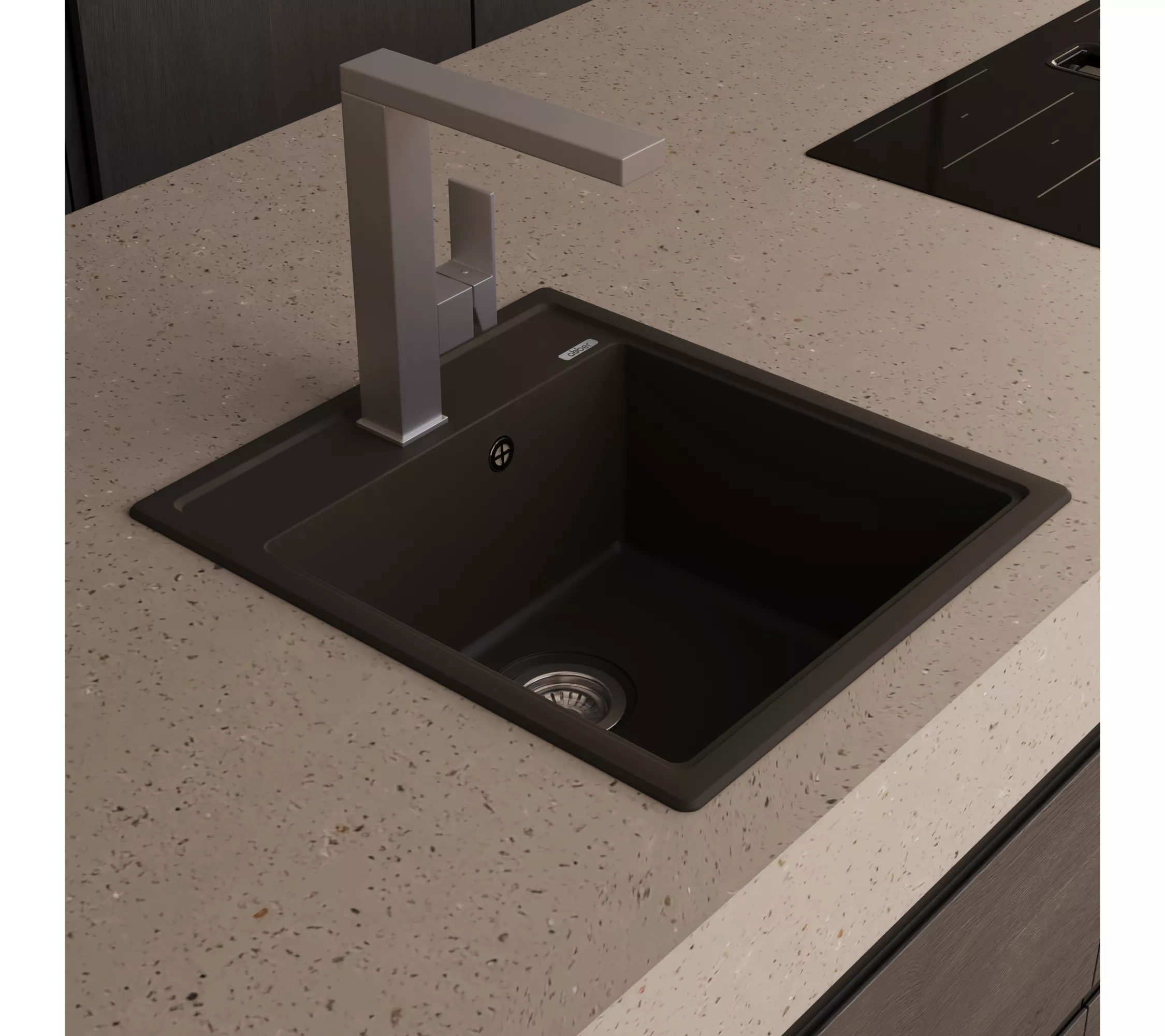 Кухонные мойки ABBER из кварцевого композита — это долговечность, надежность и простота в уходе. Черная кварцевая мойка 46х51х21,7см легко подойдет к любому дизайну кухни. Вы можете выбрать мойку с крылом или без. Чтобы очистить мойку, не нужно использовать какие-то специализированные средства. Кварцевая мойка не боится повреждений, не окрашиваются продуктами. Как натуральный камень, но лучше и дешевле!