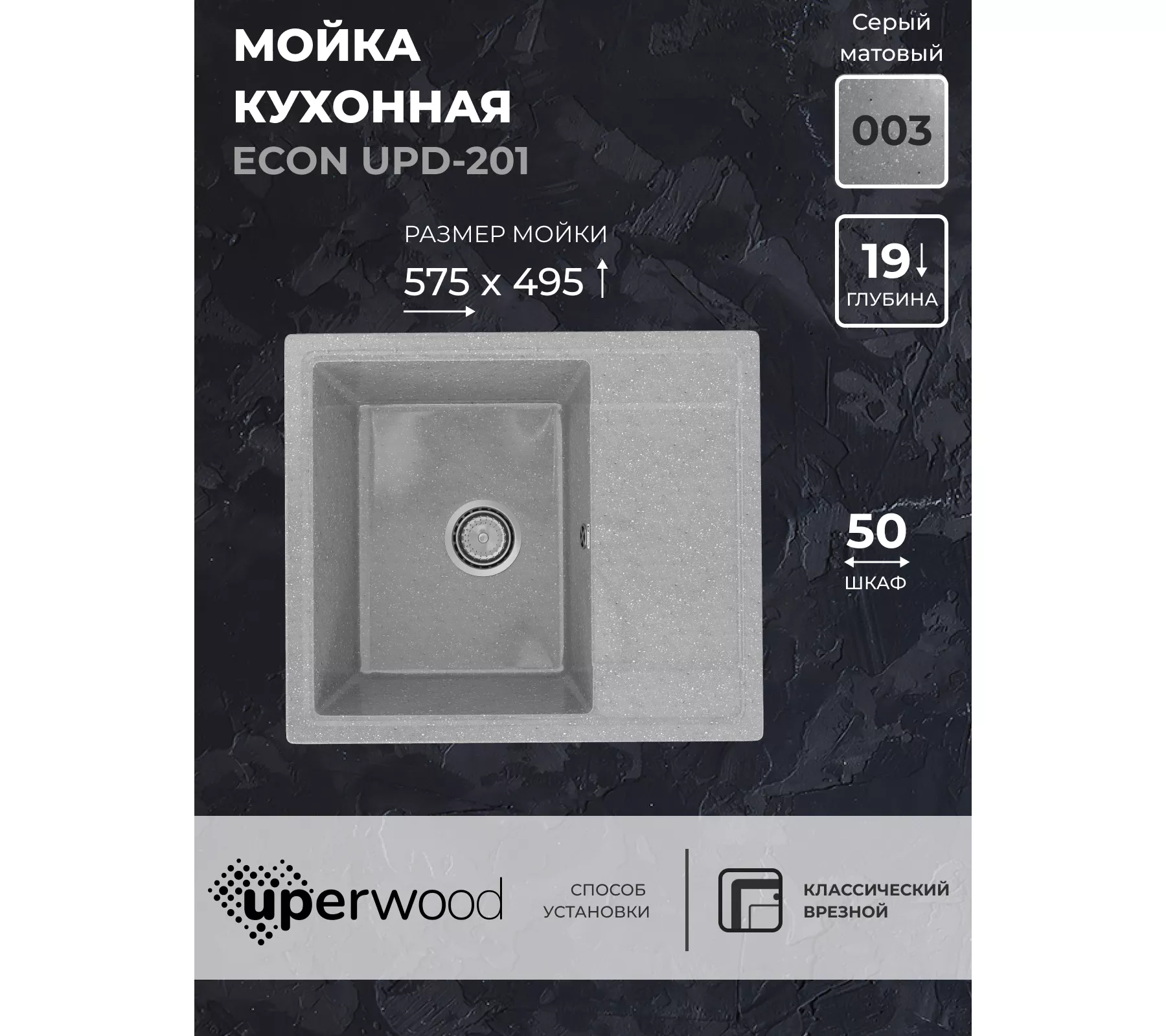 Прямоугольная мойка для кухни из искусственного камня с крылом и увеличенной чашей от бренда Uperwood. Кухонная мойка ECON UPD-201 оборачивамаемая. Крыло мойки может быть расположено как справа, так и слева, отверстие для смесителя отсутствует и вырезается с помощью фрезы на усмотрение покупателя.