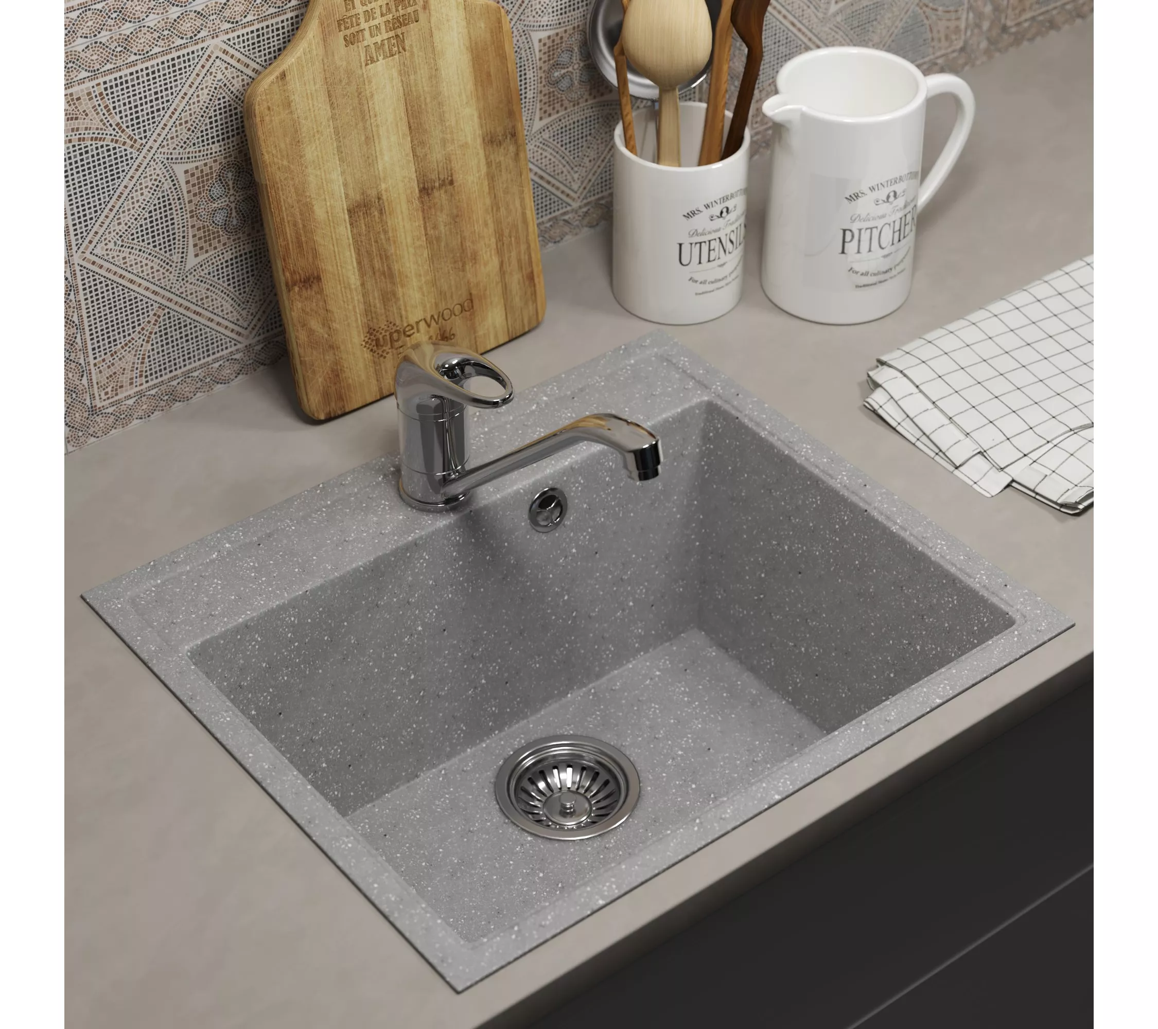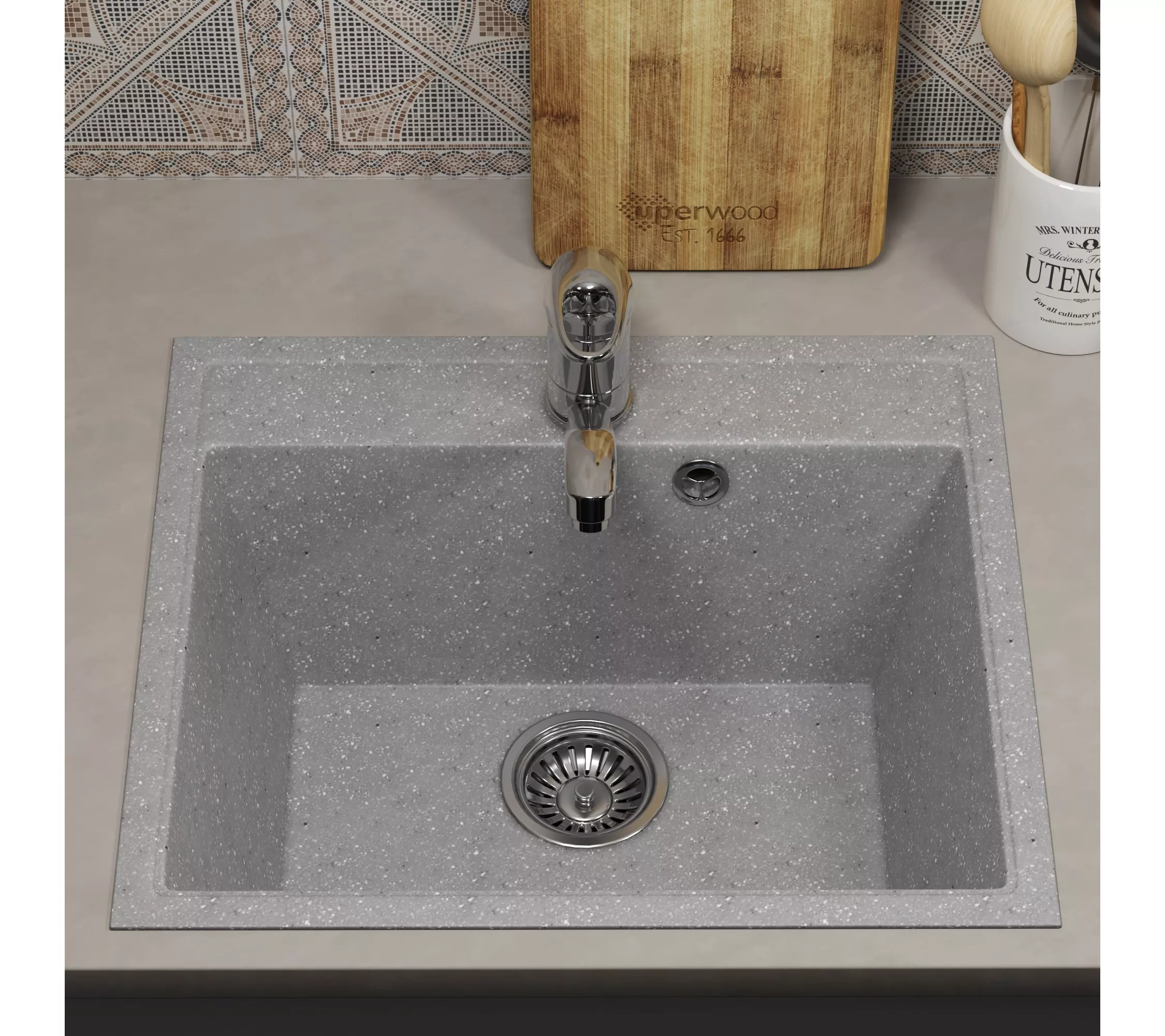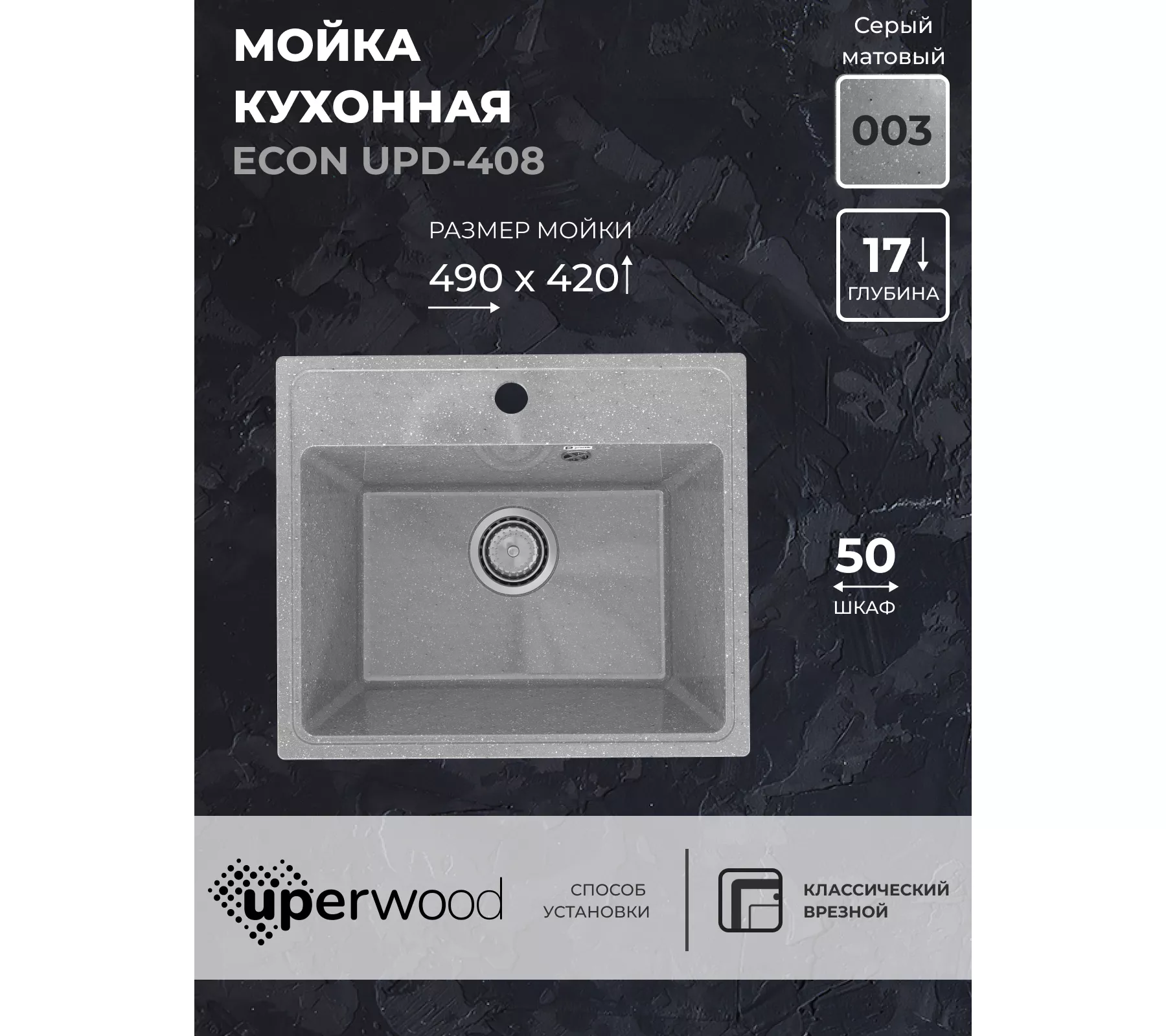 Кухонная мойка из искусственного камня Uperwood ECON UPD-408-003, прямоугольная, серая матовая