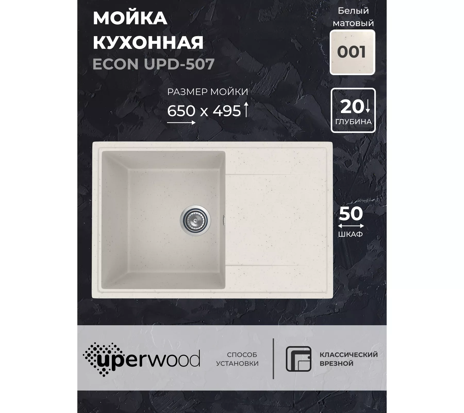 Мойка ECON UPD-507 устанавливается в шкаф шириной от 500 мм и открывает широкий спектр возможностей при проектировании кухни. Врезной монтаж в столешницу. Материал мойки представляет из себя искусственный камень на основе натурального мрамора и связующих смол. Искусственный камень существенно снижает уровень шума при падении струи воды. Специальное покрытие гелькоут защищает поверхность мойки от загрязнений и бытовых царапин, делая уход за мойкой легким и простым.