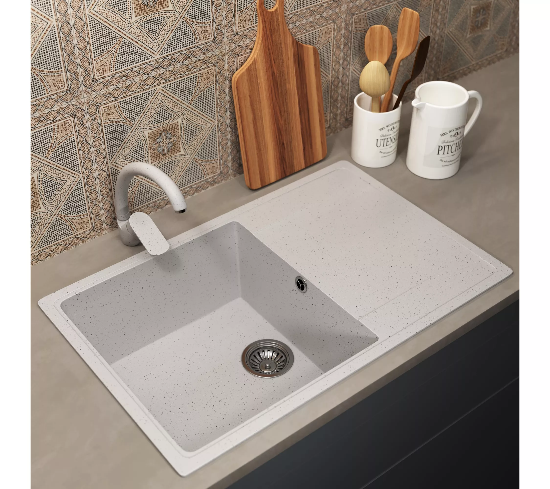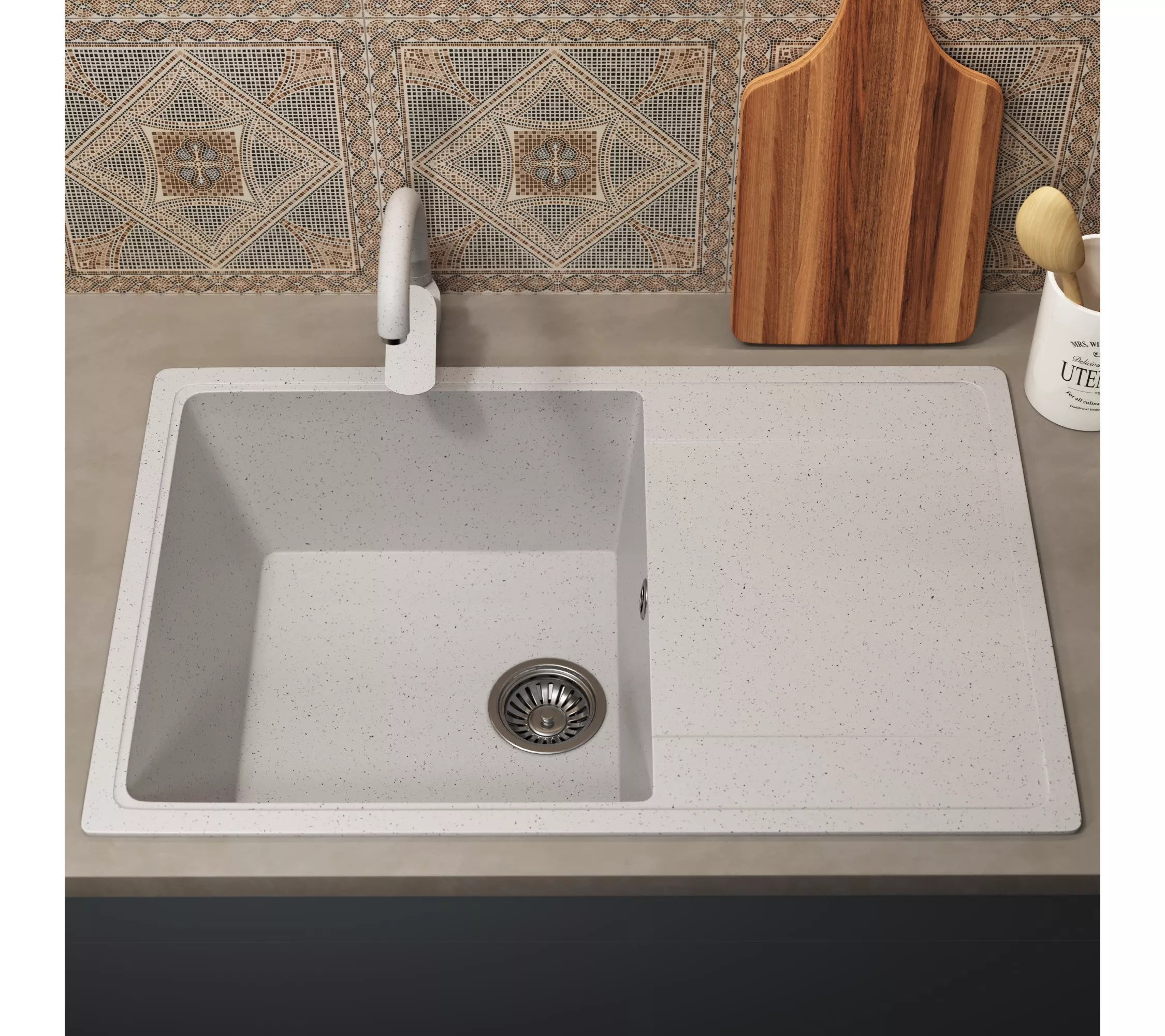 Уникальная фактура камня смотрится благородно, вписывается в любой интерьер и делает его утонченным. Мойка гладкая и приятная на ощупь, матовое покрытие. При эксплуатации не издает неприятного шума и грохота.