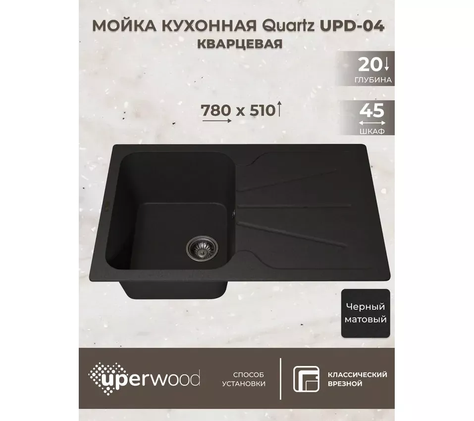 Мойка гладкая и приятная на ощупь, прочное матовое покрытие защищает мойку от любых внешних воздействий. При эксплуатации изделие не издает неприятного шума и грохота. На выбор покупателя предлагается 4 универсальных цвета для каждой модели мойки: белый, серый, бежевый и черный. Монтаж мойки врезной, установка поверх столешницы, на схеме отображено отверстие необходимого размера под каждую модель мойки из серии Uperwood Quartz. Приобретая нашу продукцию, Вы можете быть уверены в том, что приобрели товар действительно высокогокачества.