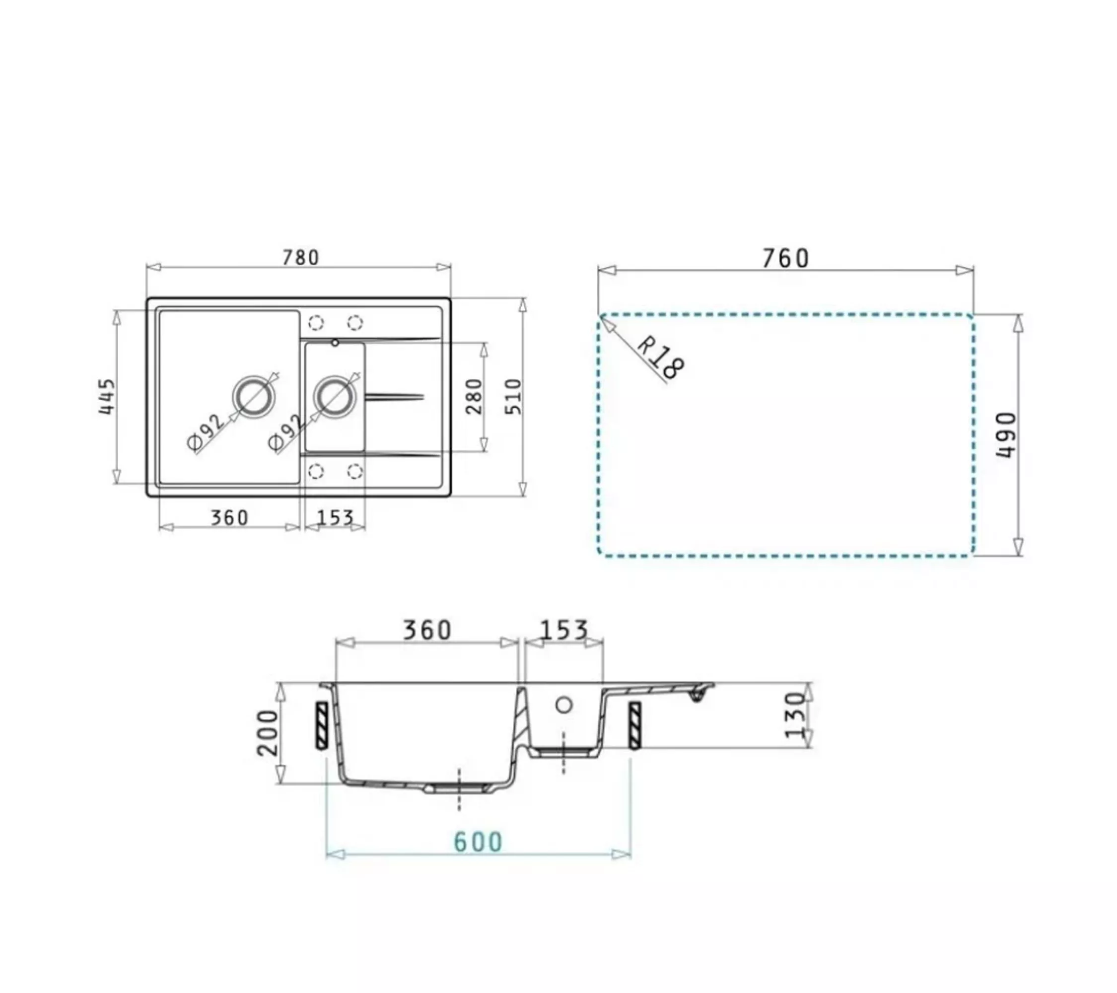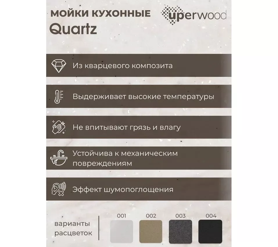 Монтаж мойки врезной, установка поверх столешницы, на схеме отображено отверстие необходимого размера под каждую модель мойки из серии Uperwood Quartz. Все кухонные мойки Uperwood из серии Quartz обладают высокой прочностью, экологической чистотой ихимической стойкостью. Во время эксплуатации изделие выдерживает температурные перепады в интервале от минус 40°С до плюс 110°С.