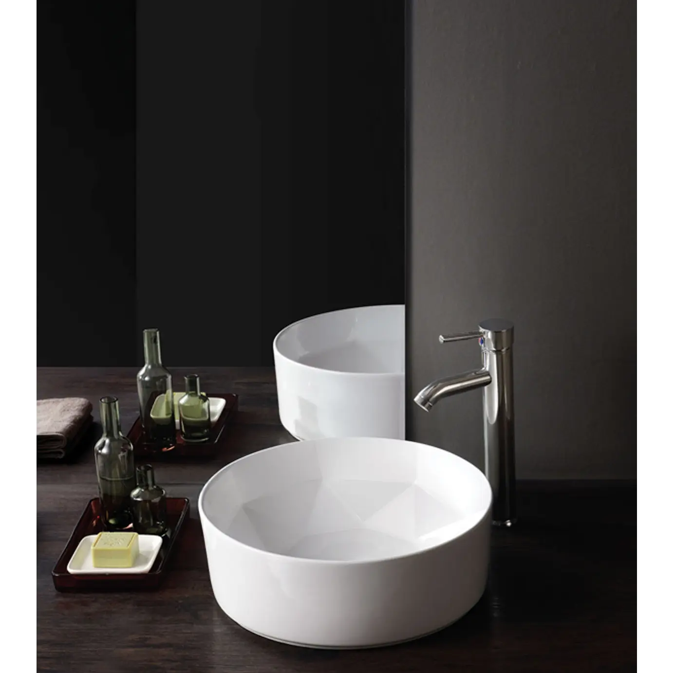 Фаянсовая, накладная. Устанавливается на столешницу. Диаметр слива: 45 мм
