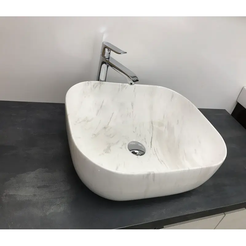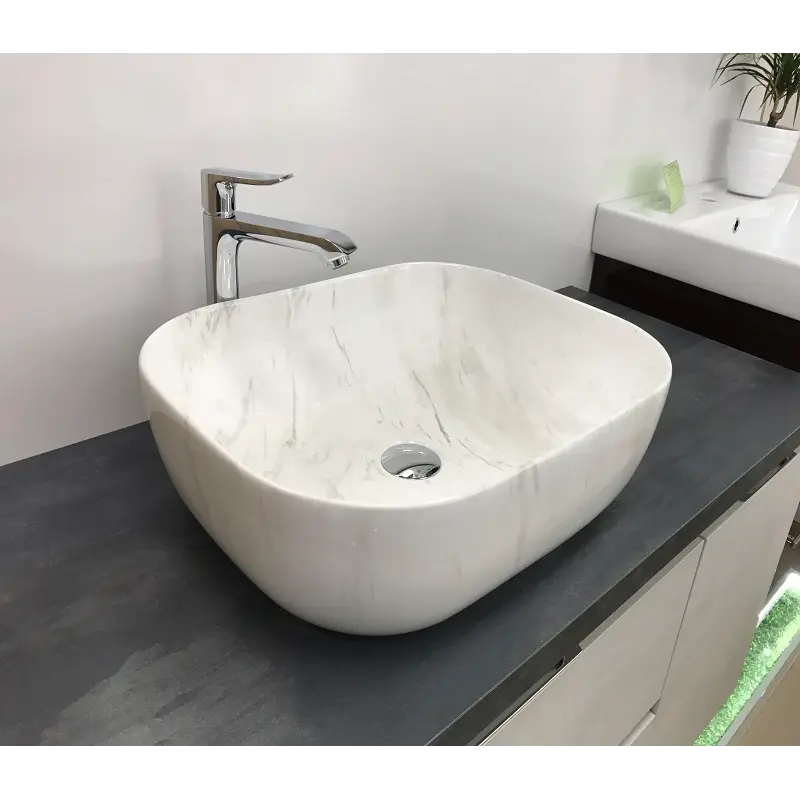 Фаянсовая, накладная. Устанавливается на столешницу. Диаметр слива: 45 мм. Донный клапан в цвет - включён в стоимость раковины.