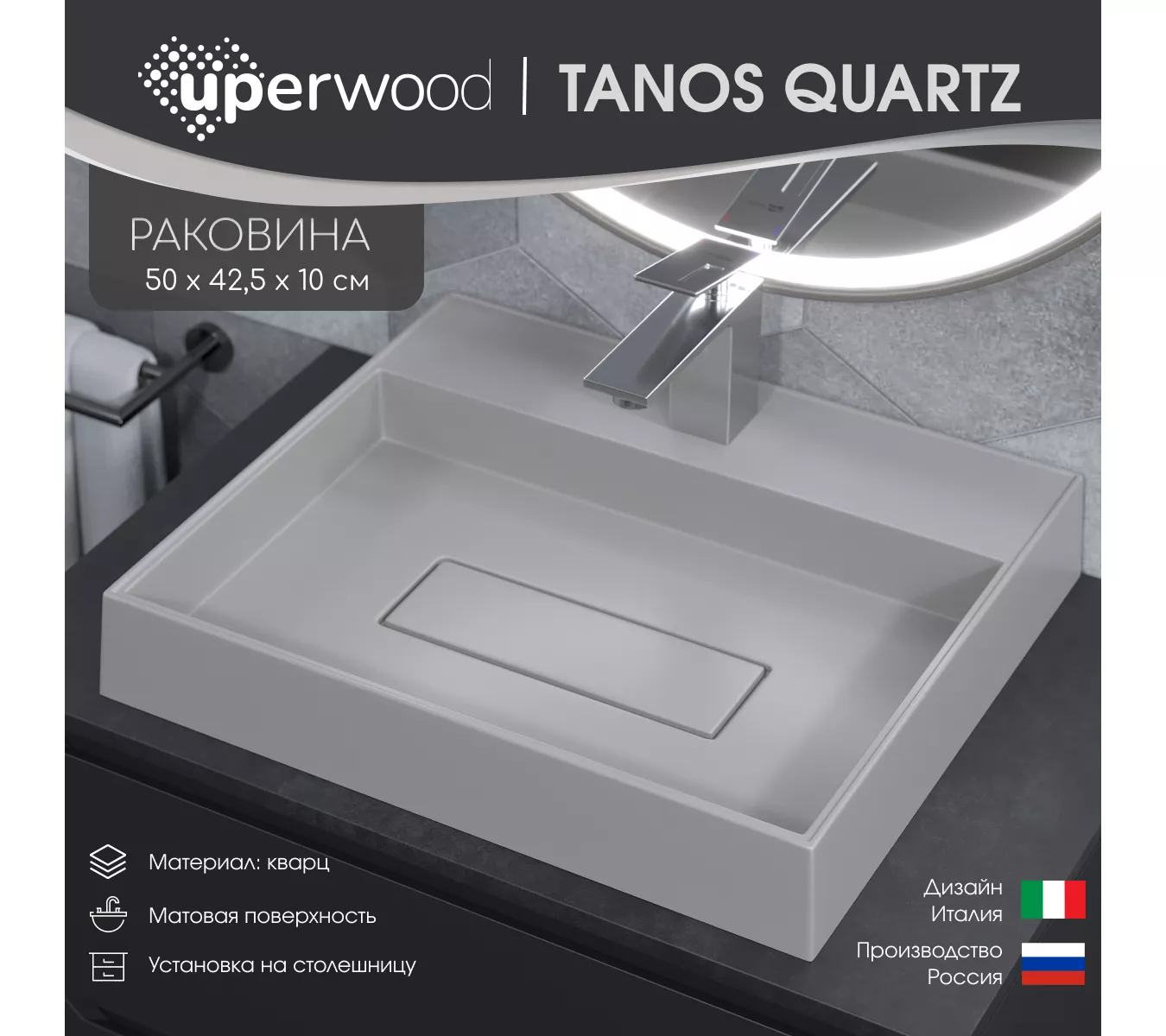 Накладные раковины для ванной комнаты от бренда Uperwood из коллекции Tanos Quartz изготовлены из кварцевого композита и предназначены для установки на столешницу.Особый состав этого материала делает раковину устойчивой к термическим воздействия и бытовым загрязнениям, придает высокую твердость, ударопрочность, стойкость к истиранию и царапинам.