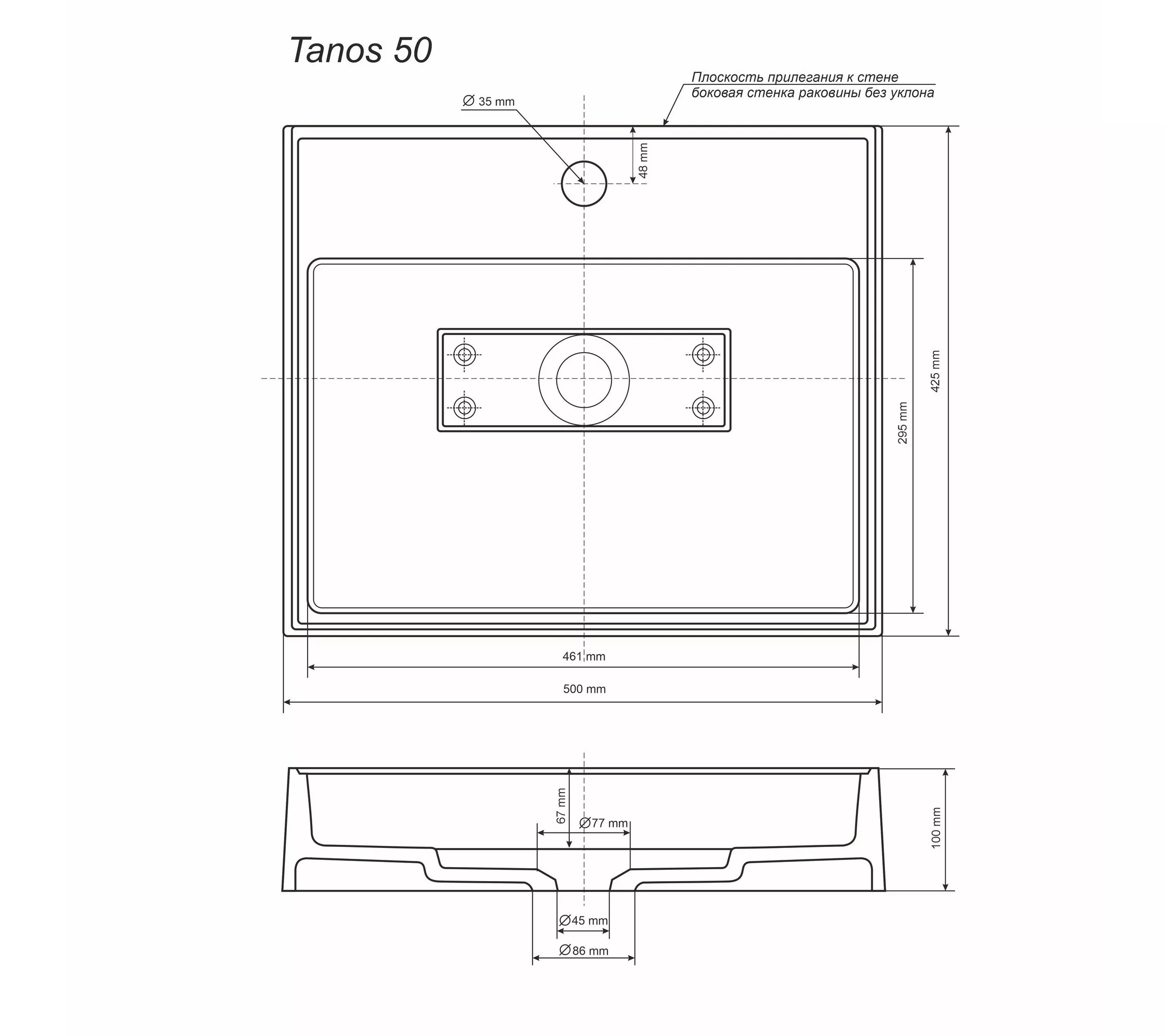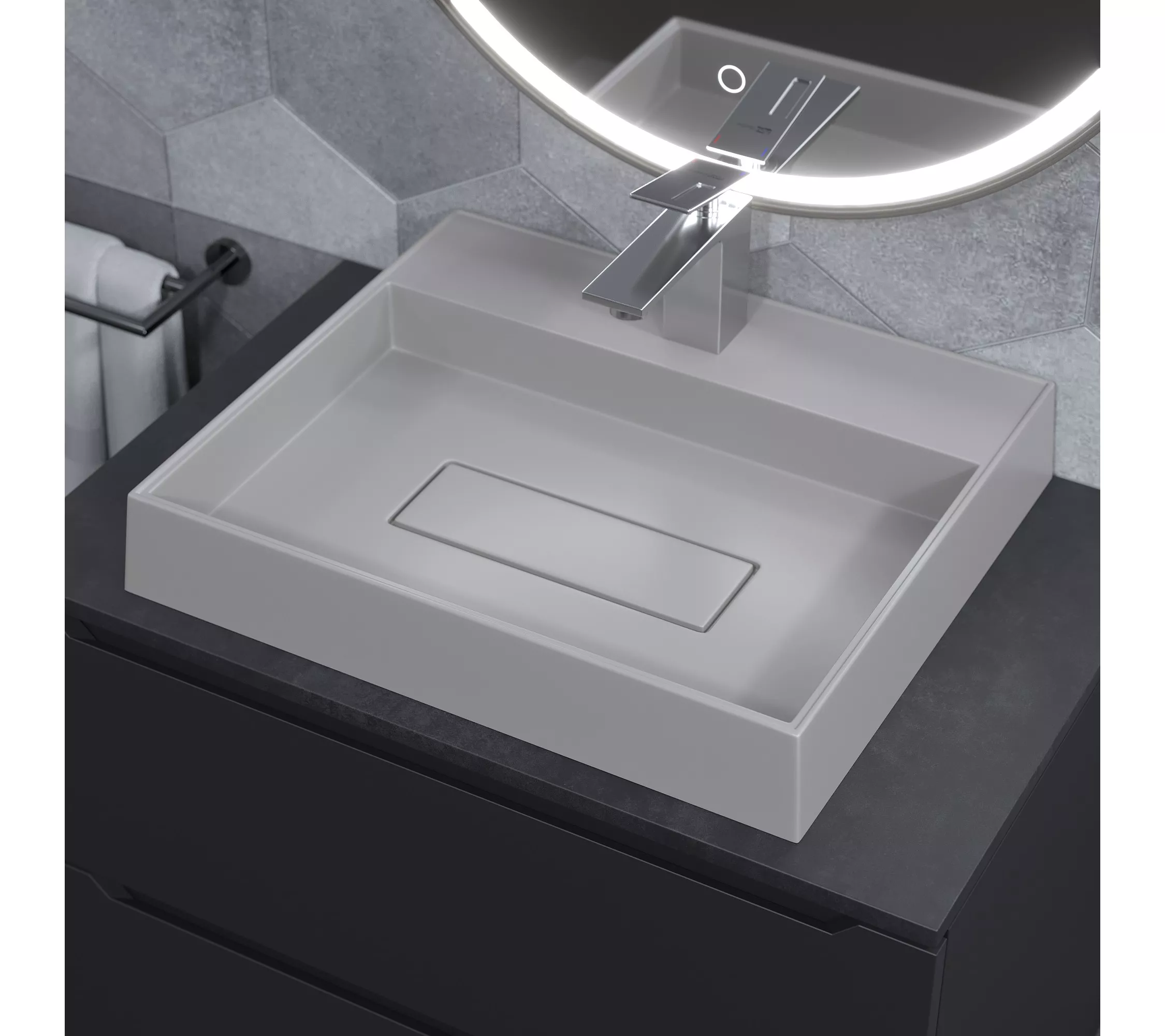 Раковины Tanos Quartz имеют отверстие для установки смесителя и бортик для размещения ванных принадлежностей.