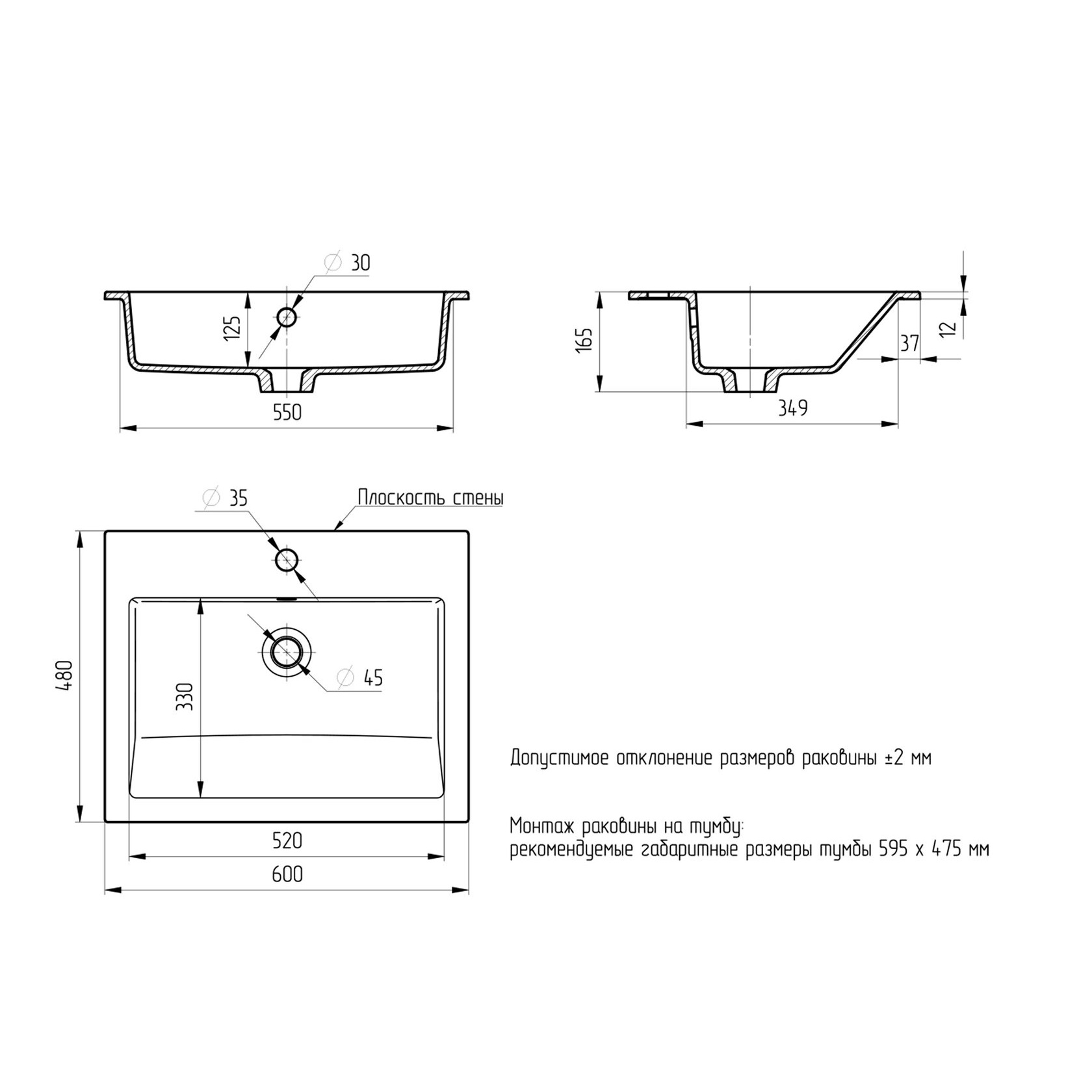 Минимальный рекомендуемый установочный проем в столешнице: 55х34,9 см.