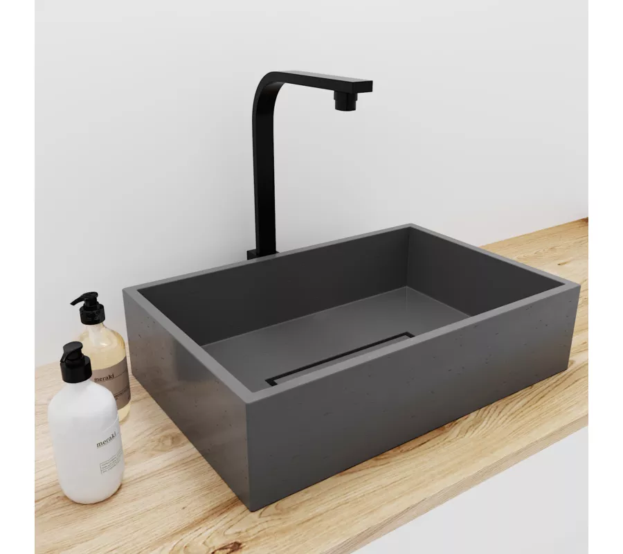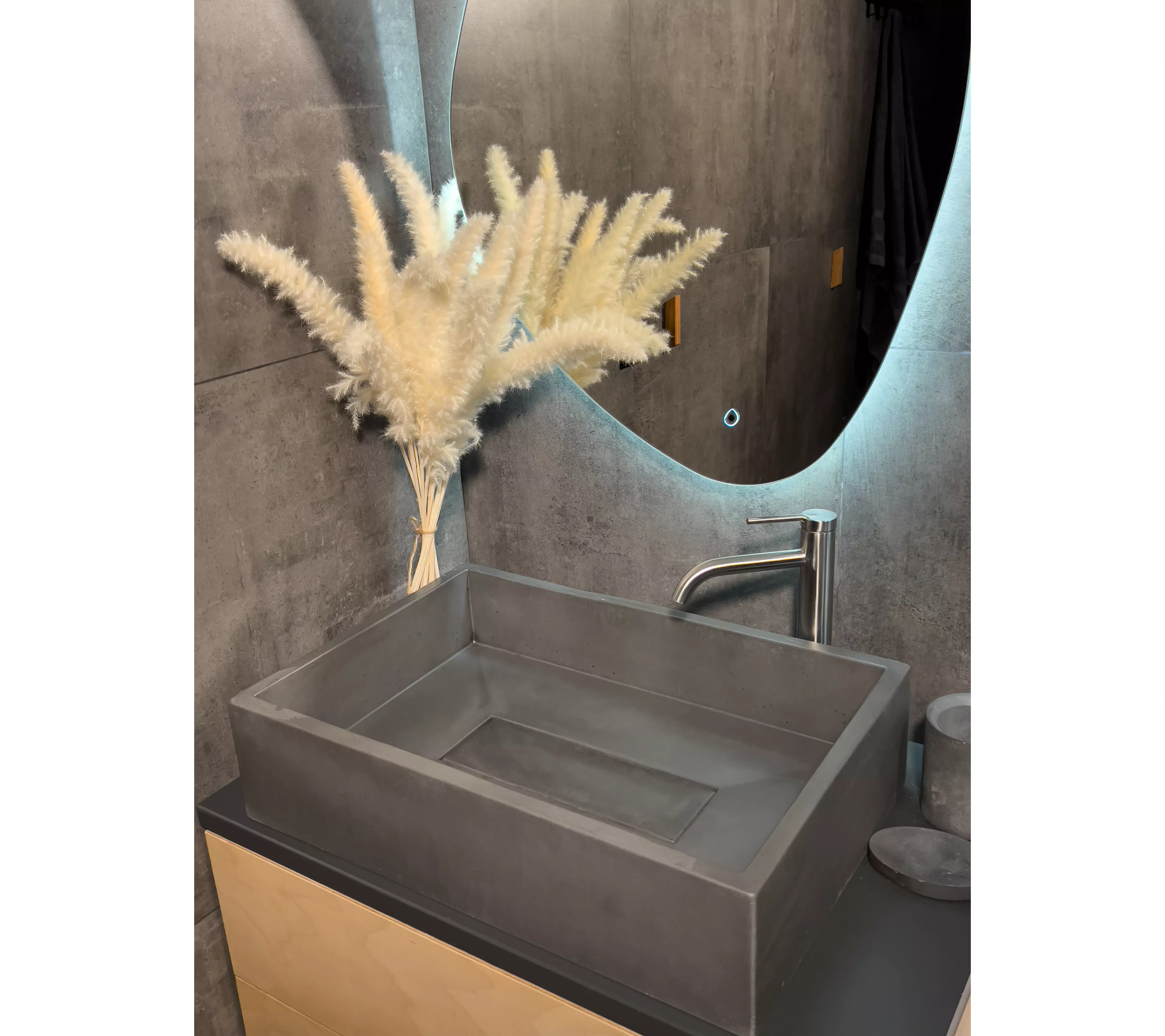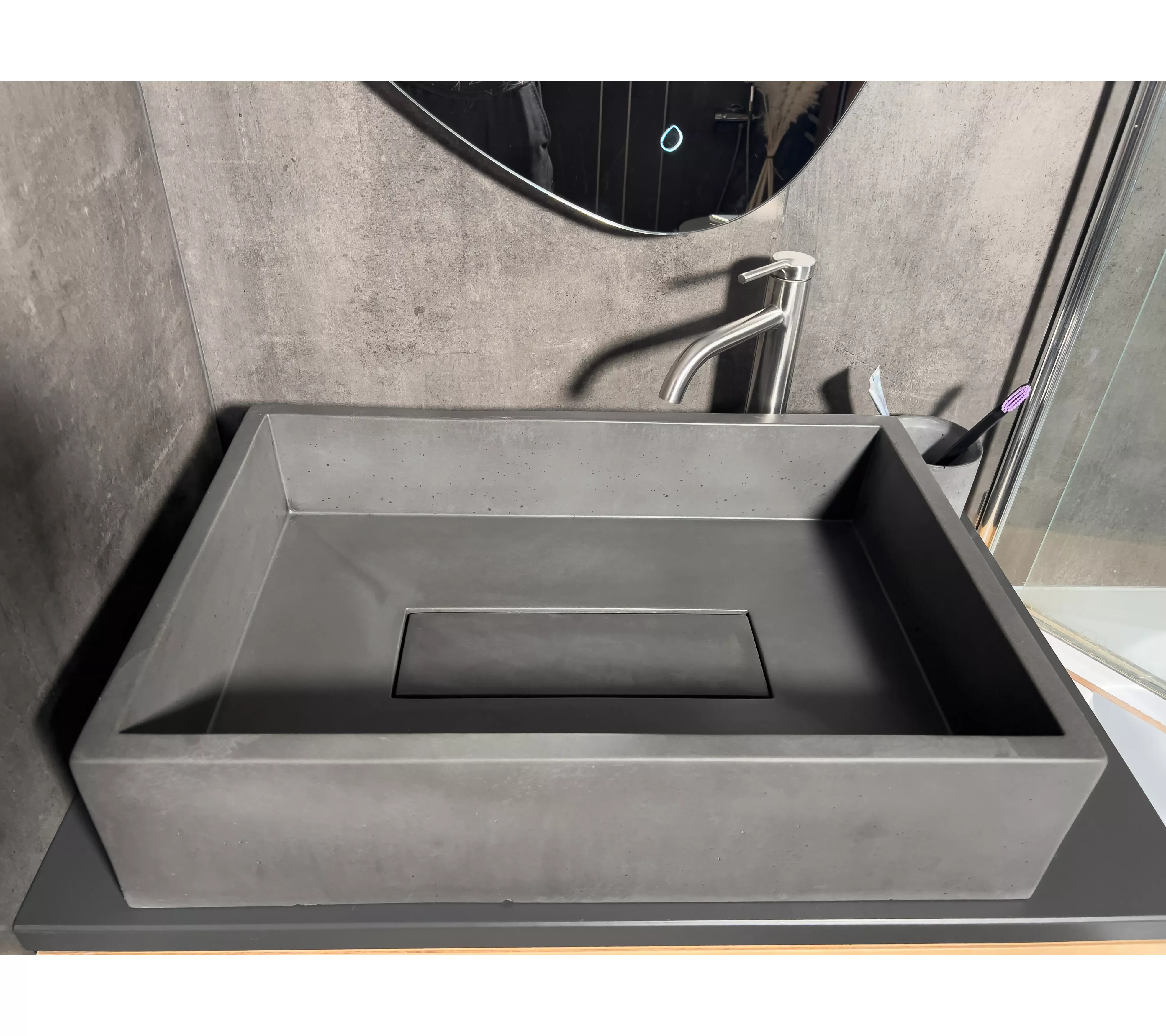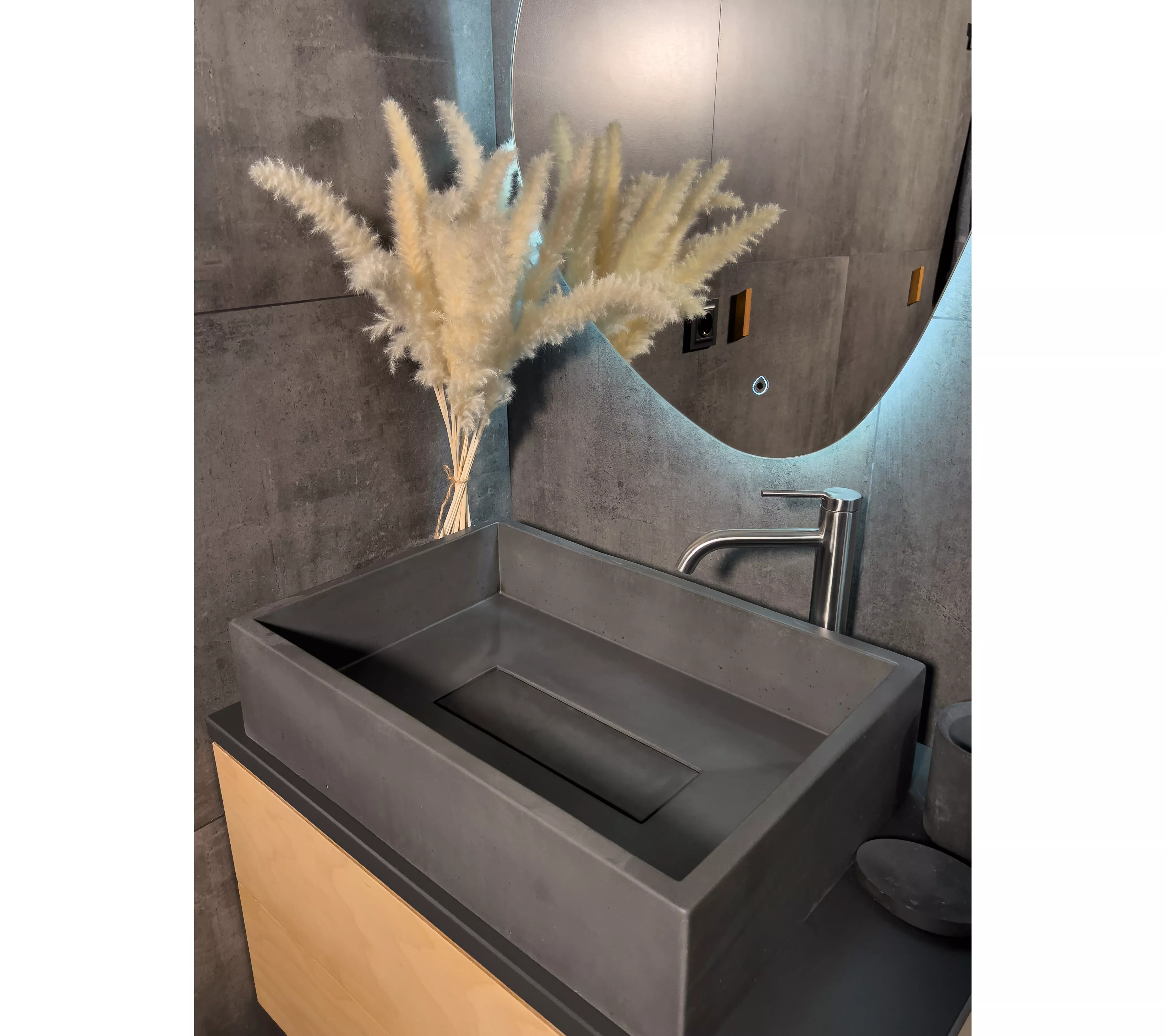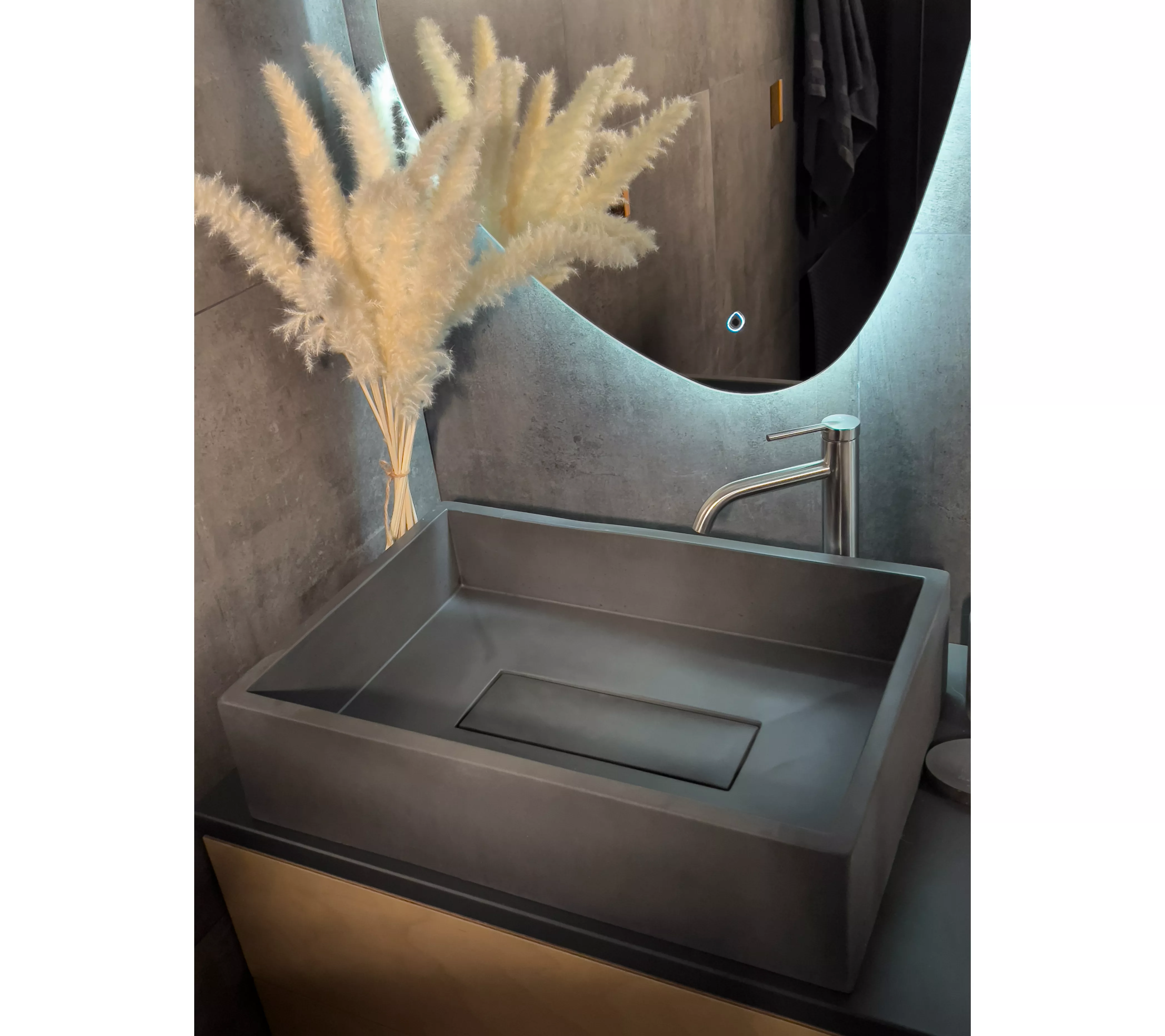 Раковина для ванной комнаты накладная, бетонная Uperwood Angkor 60 см, прямоугольная, графит, на тумбу, мойка, умывальник для туалета.Умывальник на столешнице популярен своей абсолютной простотой и чистой формой, сочетающей бетон с прямыми углами. Минималистский, вневременной и функциональный выбор, который удивит вас очень тонкими стенами и простотой обслуживания.Раковина смотрится очень оригинально благодаря закрытому сливу.Как и любая другая бетонная раковина, изготовленная вручную, имеет уникальную фактуру и цветовые оттенки.