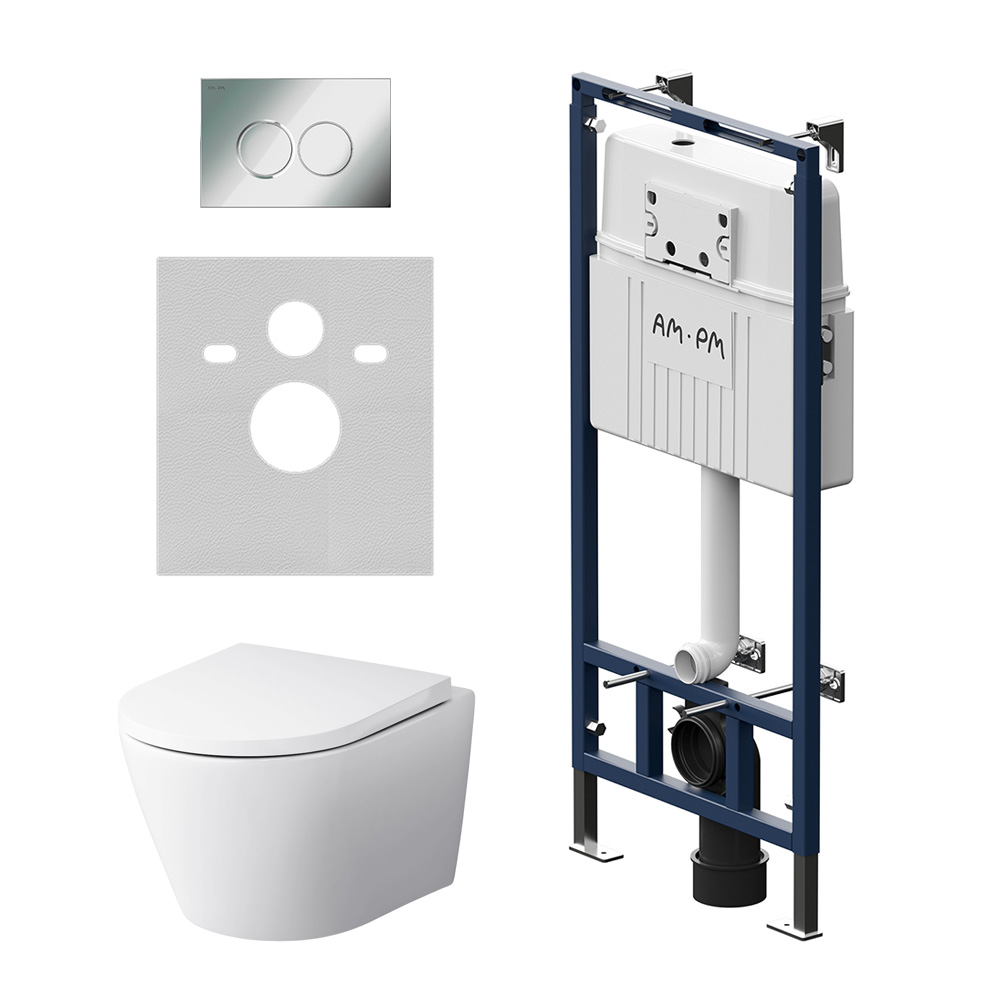 Полностью готовый к установке комплект: система инсталляции с клавишей подвесной унитаз с сиденьем включающий все необходимые крепления патрубки звукоизолирующую прокладку. Экономия пространства благодаря узкому бачку – 120 мм глубиной. Заливной клапан с низким уровнем шума - Класс II согласно европейского стандарта EN 14124.