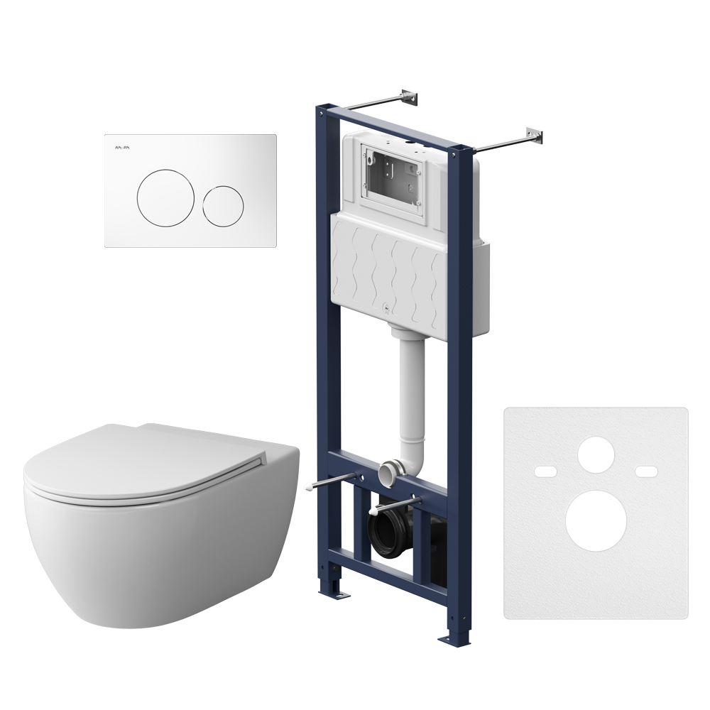 Полностью готовый к установке комплект: система инсталляции с клавишей подвесной унитаз с сиденьем. Неразборная рама из стального профиля выдерживает нагрузку до 400 кг. Полностью изолированный бачок с качественной двухрежимной смывной арматурой укомплектован пневматической клавишей в цвете белый. В комплекте все необходимые патрубки и крепления а также прокладка между унитазом и стеной - звукоизоляция.