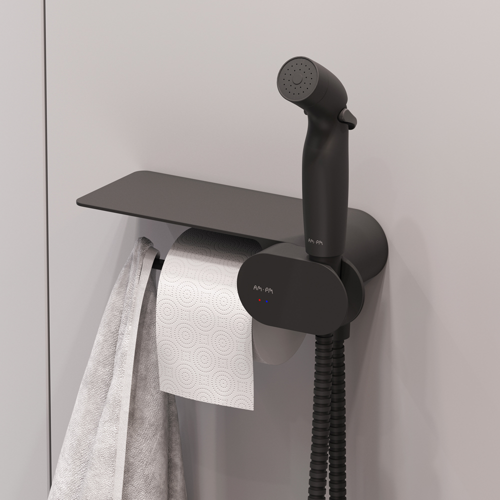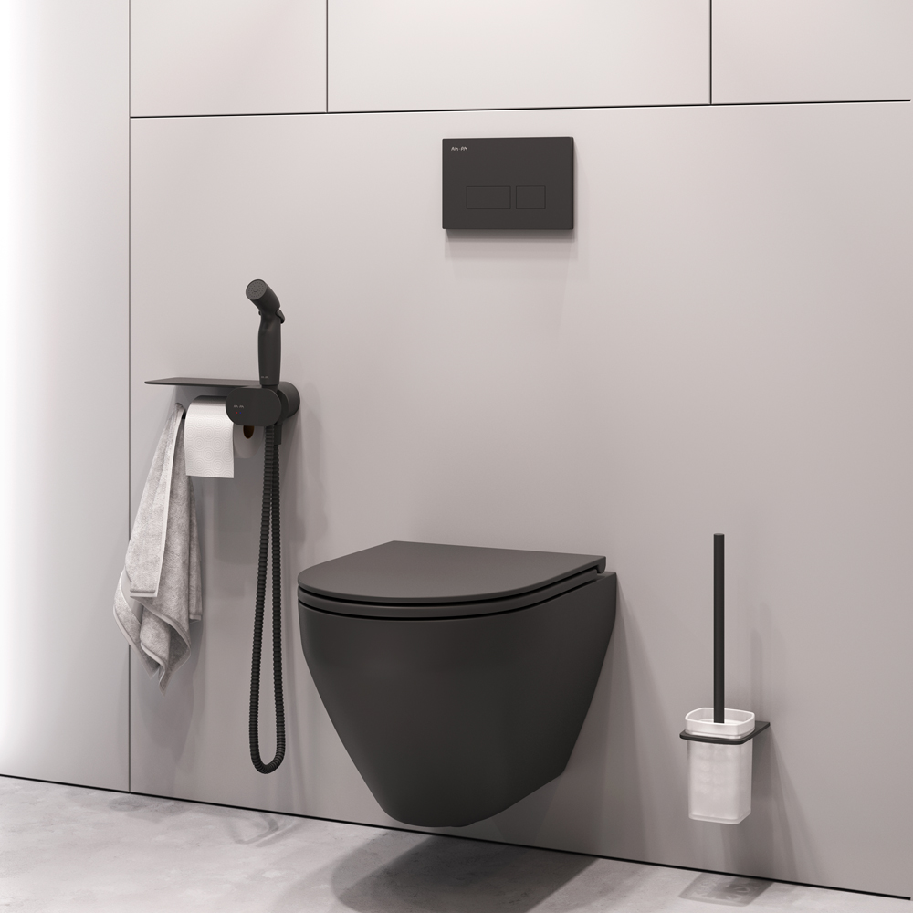 Инновационное и стильное дизайнерское решение для вашей туалетной комнаты от AM.PM. Полностью готовый к установке комплект: подвесной унитаз FlashClean гигиенический набор с полкой cтойка с туалетной щеткой.