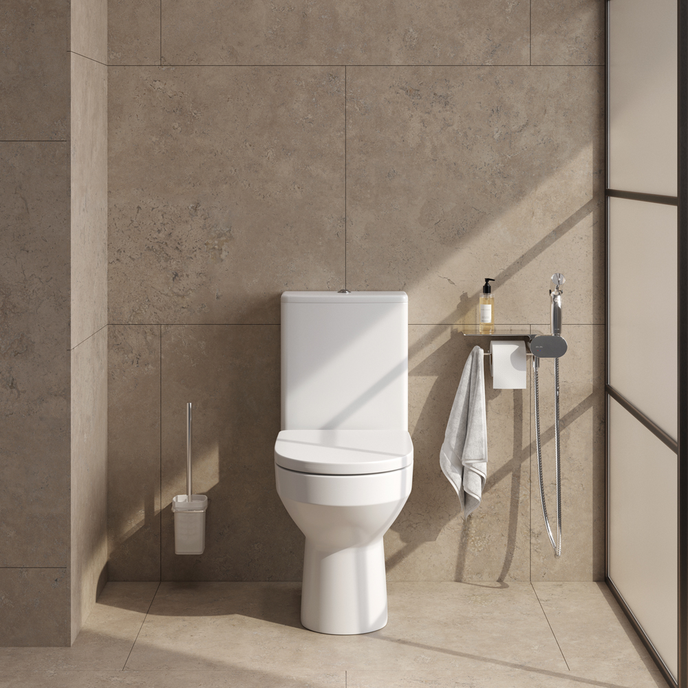 Материал сиденья дюропласт устойчивый к появлению царапин в сочетании с креплениями из нержавеющей стали гарантируют долговечность сиденья. Многофункциональный гигиенический набор представляет собой удобную полочку на которой можно разместить все что необходимо вам под рукой. На интегрированном держателе можно размещать туалетную бумагу а на крючке - полотенце. Завершает комплект подвесная cтойка с туалетной щеткой в стиле Hi-Tech. Продуманный дизайн и удивительные детали – отделение для хранения в держателе для туалетной бумаги. ""